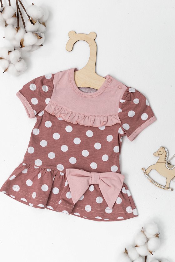 Платье выполнено из кулирки, 100% хлопок. Изделие с коротким рукавом, застёжка на кнопках на плече. Спереди платье украшено оборкой и бантом.