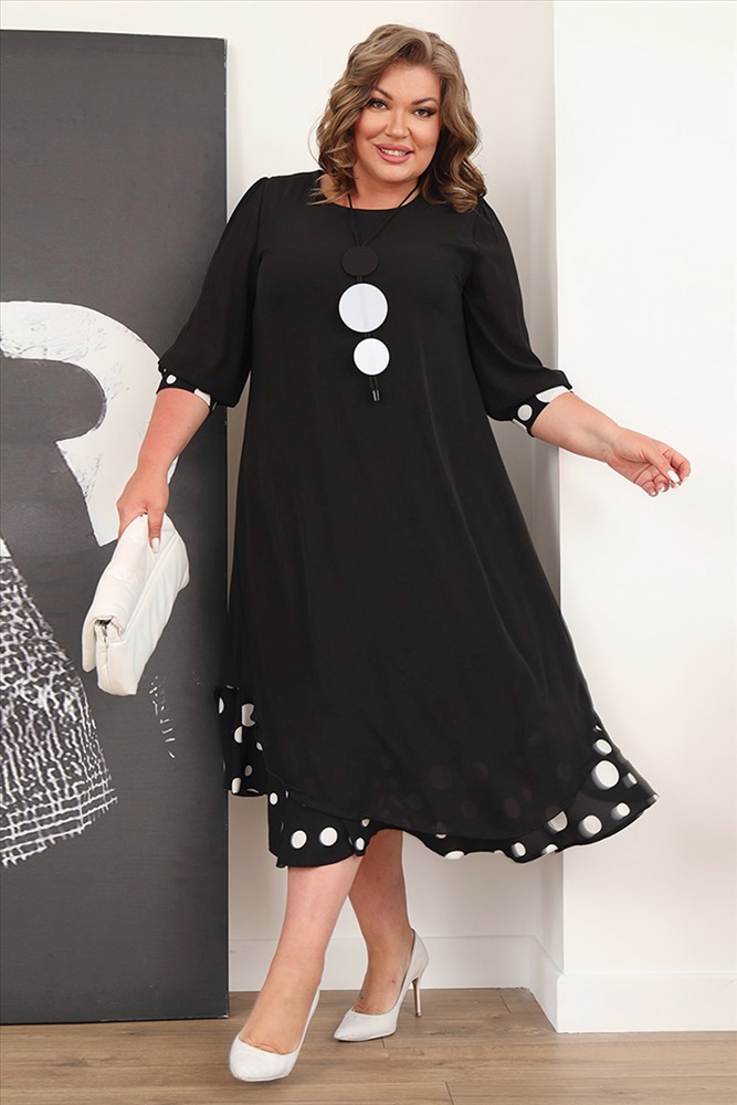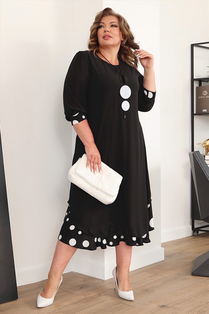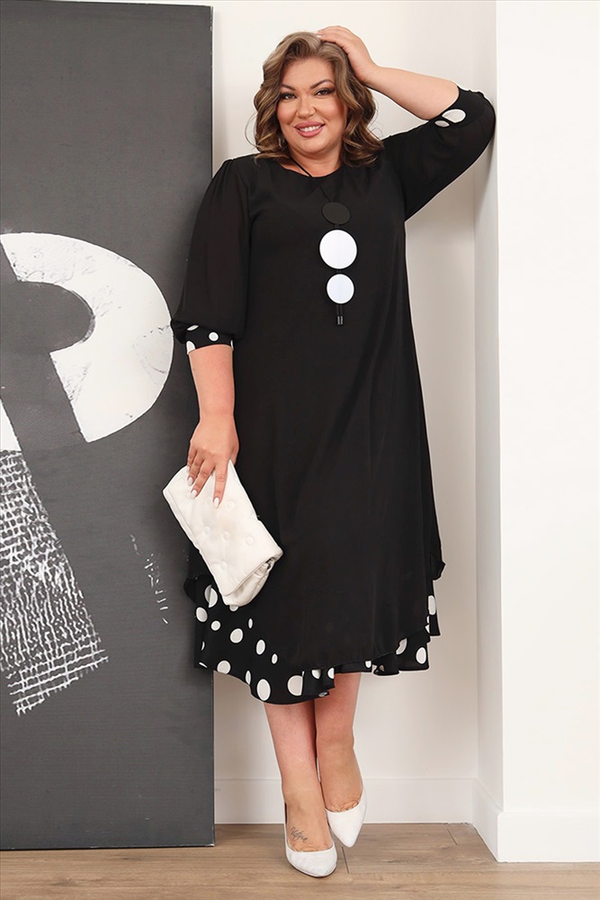 Элегантное платье мягкого материала на подкладке. Модель имеет круглый вырез и рукава длиной 3/4, оформленные контрастным кантом по низу. Свободная юбка верха с асимметричными краями искусно обыгрывает фигуру и подчеркивает женственность образа. Подол нижней юбки с гороховым принтом придает модели женственности и романтизма. Полуприлегающий силуэт искусно обыгрывает фигуру и визуально стройнит. Нарядности добавляет оригинальное ожерелье. Платье станет идеальным нарядом для любого повода. Стильный клатч и туфли на каблуках станут идеальным дополнением к нарядному образу.