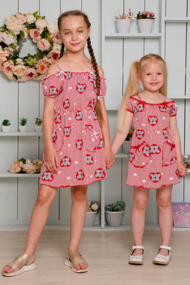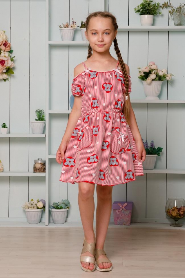 Платье детское летнее. Приталенного силуэта, на тонких бретелях. Верх платья оформлен декоративной кружевной резинкой. По линии талии изделие собрано на тонкую резинку. Снизу на полочке два накладных кармашка с бантиками из атласной тесьмы. Все срезы изделия обработаны декоративной краеобметочной строчкой.