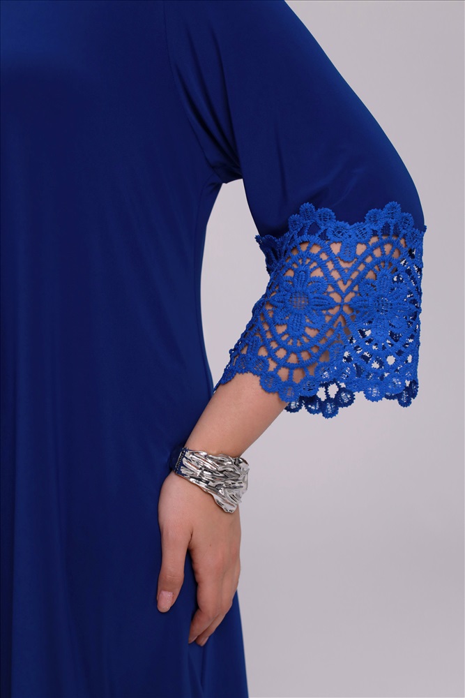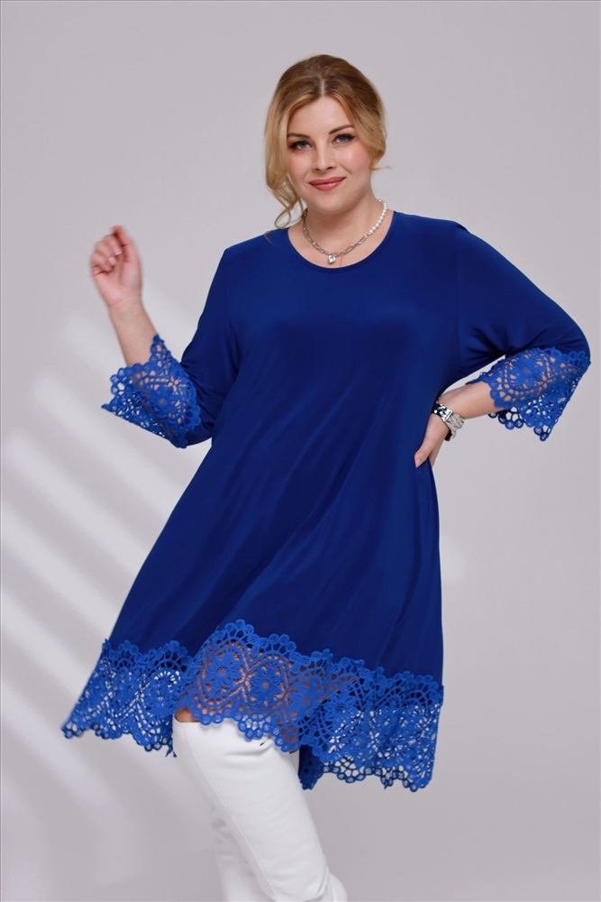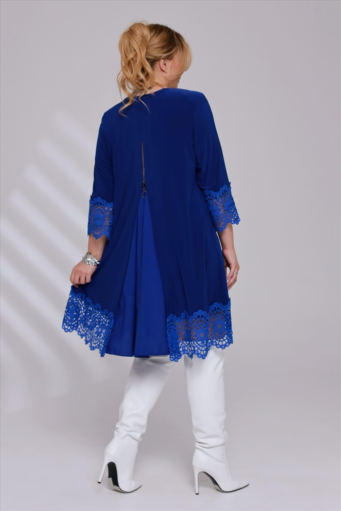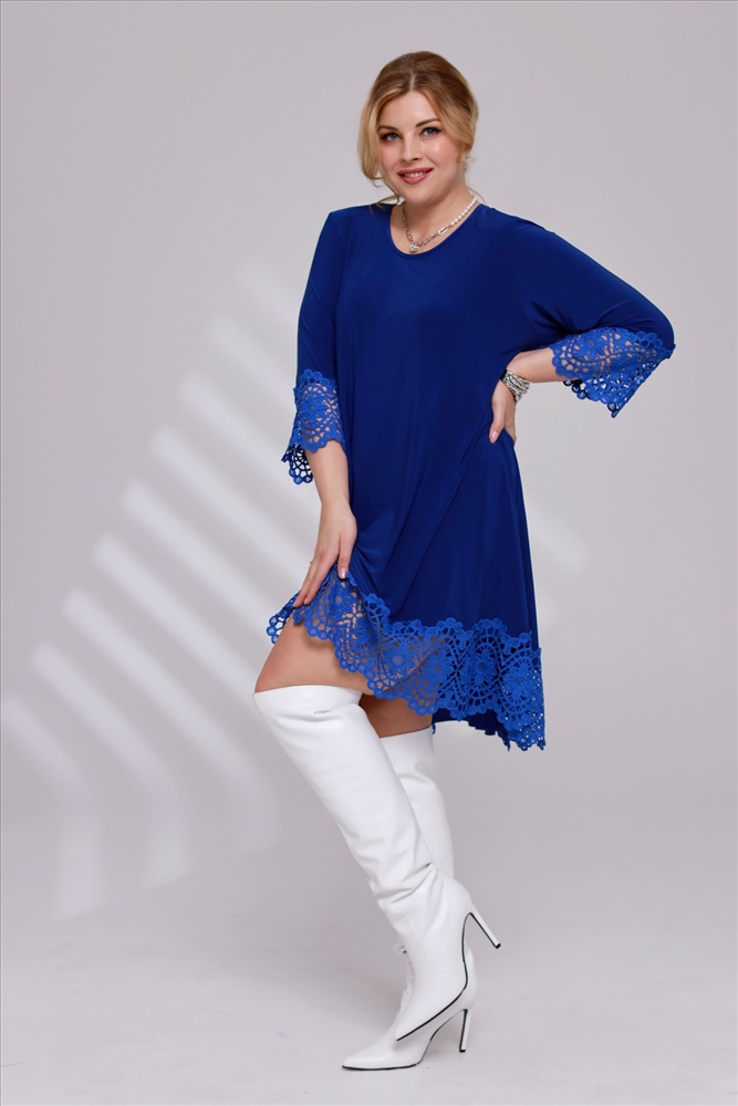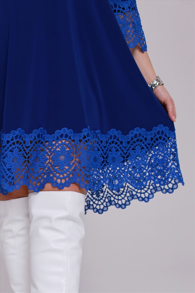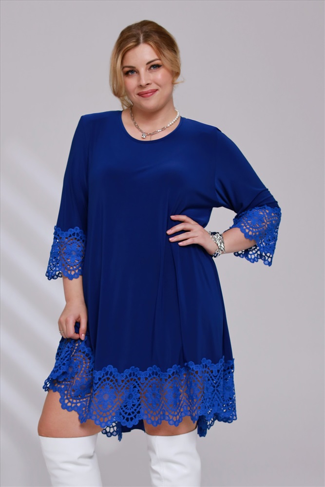Платье - туника из мягкого трикотажа станет украшением Вашего гардероба. Имеет круглый вырез и рукава длиной 7/8, которые как и подол модели украшены ажурным кружевом, придавая модели нежности и романтичности. Свободный крой искусно обыгрывает фигуру, а вытачки на груди обеспечивают идеальную посадку. Оригинальная шифоновая вставка по спинке декорирована молнией. Небольшие подплечники стройнят и зрительно вытягивают силуэт, делая образ более изящным и утончённым. Эта модель станет отличным выбором для тех, кто хочет добавить в свой гардероб что-то особенное и нарядное.