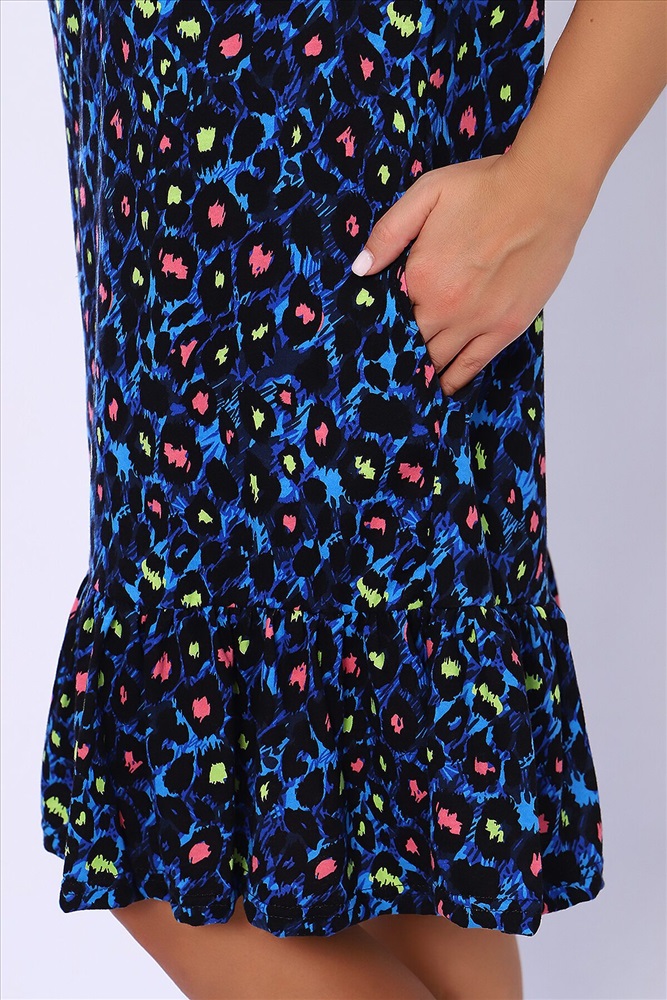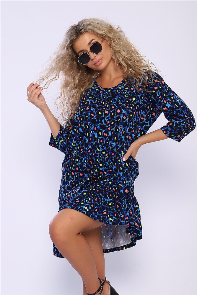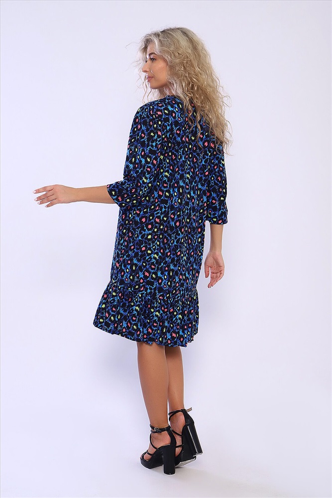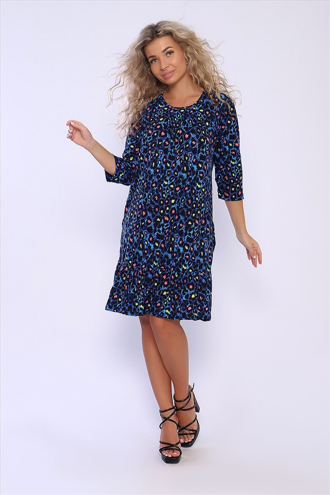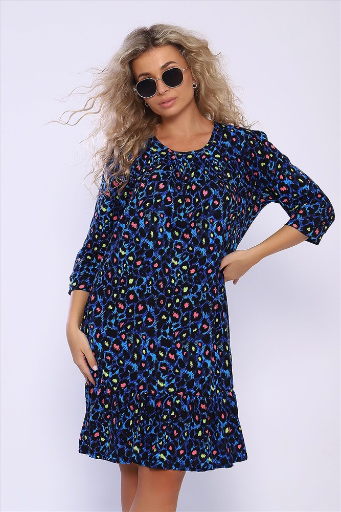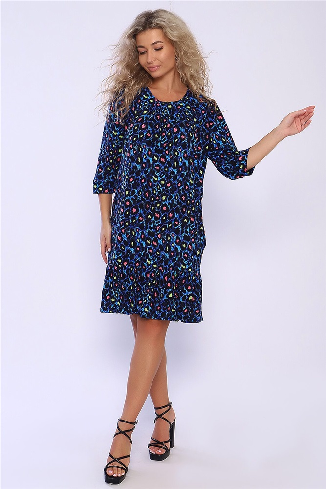 Свободное платье с карманами в боковых швах и воланом со сборкой по низу. Рукава длиной 3/4 со сборкой и на манжетах. На полочке в зоне декольте заложены складки. Необходимый элемент гардероба для легких образов.