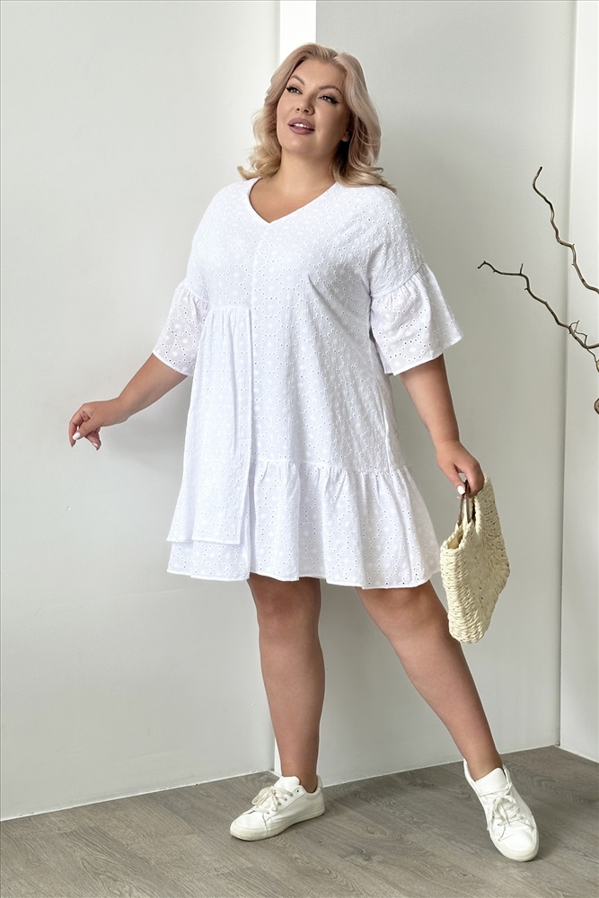 Стильное платье из мягкого хлопка не займет много места и вынув из чемодана, можно сразу надеть, не прибегая к глажке. Модель имеет V-образный вырез. Вытачки на груди способствуют оптимальной посадке по фигуре. Цельнокроеные рукава длиной 3/4 украшены кокетливыми воланами. Оригинальная перфорация с вышивкой по всему изделию добавляет модели динамичности. По переду платье украшено ярусом, что создает модели романтизма и женственности. Эта модель не сковывает движений, а приятный материал дарит комфорт на весь день. Платье создано для того, чтобы подчеркнуть сильные и скрыть слабые стороны каждой модницы, Вам нужно лишь добавить туфли на каблуках и полностью готовый образ. Лаконичное платье полуприлегающего силуэта отлично подходит как для повседневной носки, так и для торжества.