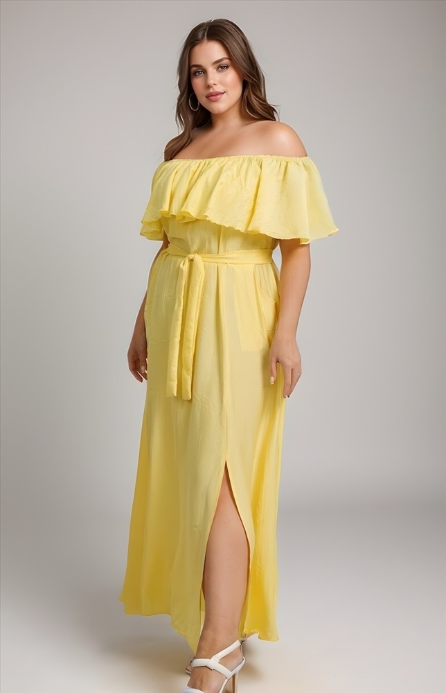 Романтичное платье-макси из мягкого материала. Модель без рукавов. Эластичный широкий вырез с романтичными воланами можно носить в стиле "Кармен". Платье отрезное по линии талии со съемным поясом в тон, которым можно обозначить талию. Расклешенная струящаяся юбка искусно обыгрывает область бедер, а глубокий разрез сбоку добавляют образу женственности и романтизма. По бокам практичные глубокие карманы. Легкий струящийся материал виртуозно обыгрывает фигуру благодаря свободному крою модели. Платье создано для того, чтобы подчеркивать достоинства и скрывать недостатки, Вам нужно лишь добавить обувь на каблуках и идеальный образ готов.