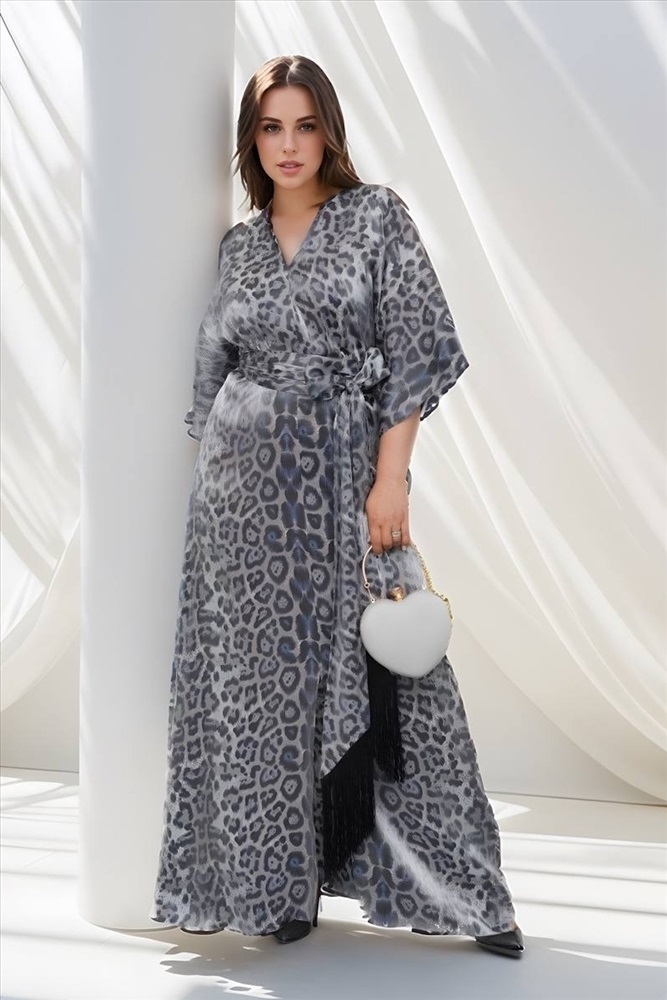 Платье шелковое с запАхом с бахромой по низу "леопард" серое