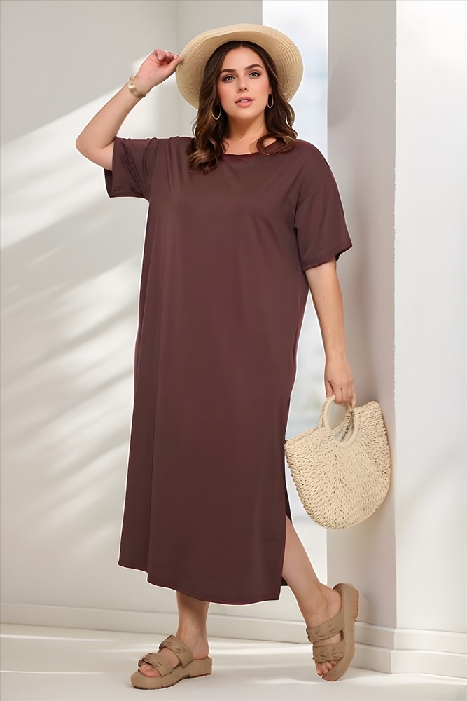 Платье - футболка прямого кроя из мягкого трикотажа. Модель имеет круглый вырез с узким кантом по краям и короткие приспущенные рукава. Свободный силуэт искусно обыгрывает фигуру и не сковывает движений. Небольшие разрезы по бокам обеспечивают оптимальную посадку по фигуре. Полуприлегающий силуэт не сковывает движений и искусно обыгрывает фигуру, маскируя мелкие недостатки. Для завершения стильного образа можно использовать как туфли на высоких каблуках, так и спортивную обувь.