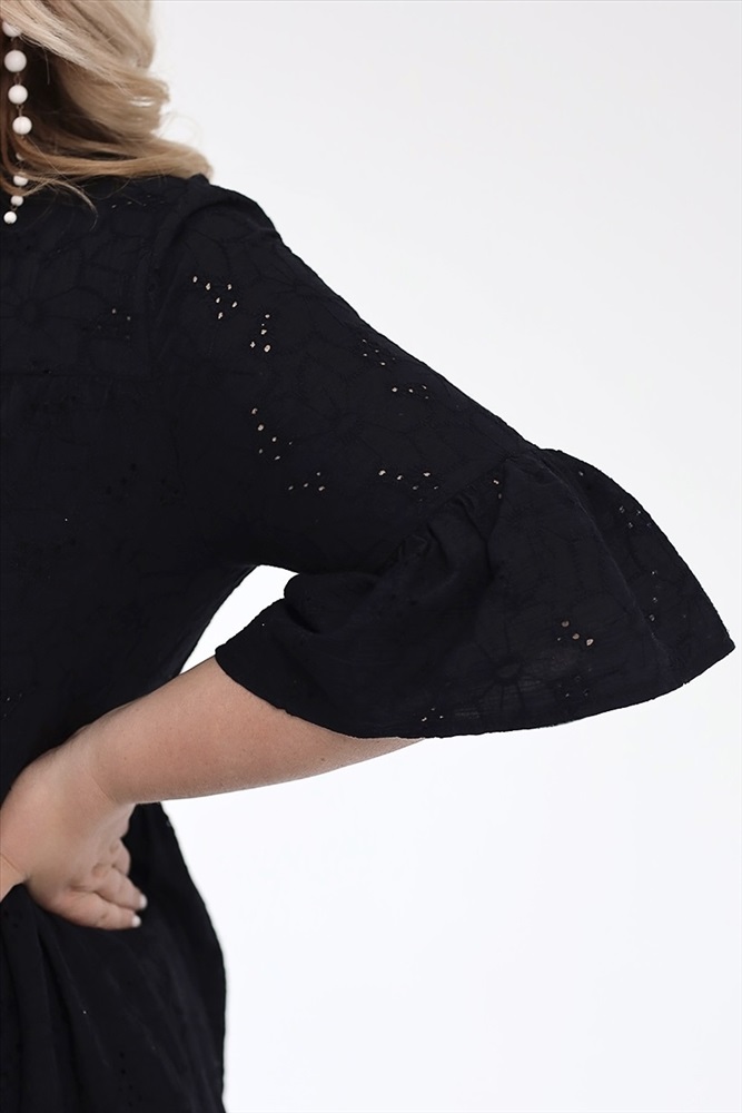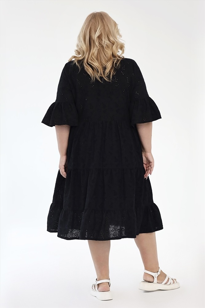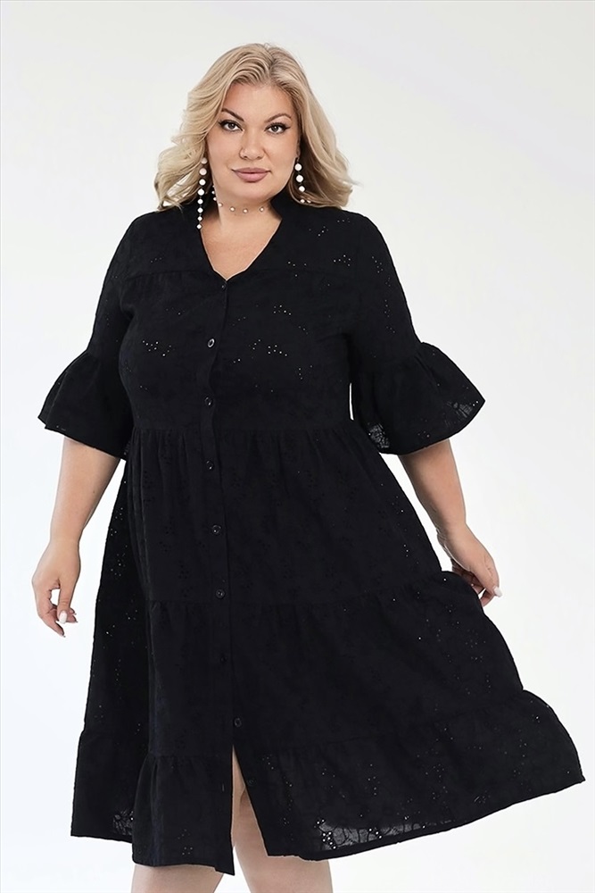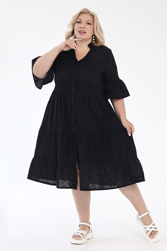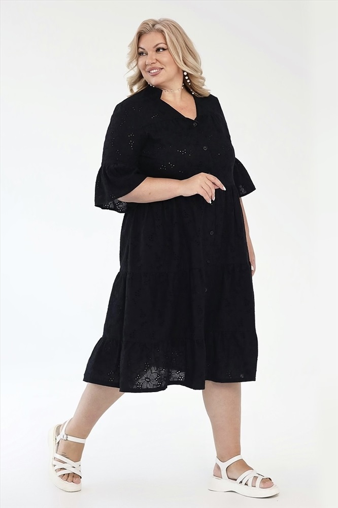 Стильное платье не занимает много места и вынув из чемодана, можно сразу надеть, не прибегая к глажке. V-образный вырез дополнен воротом-стойкой. Рукава длиной 3/4 дополнены кокетливым воланом. Кокетки на плечах способствуют оптимальной посадке по фигуре. Нежная вышивка с перфорацией по всей длине освежает образ и придаёт модели нарядности. Платье отрезное по линии груди с многоярусной расклешенной юбкой. Модель застёгивается на пуговки по всей длине под планку. Свободный крой не сковывает движений и скрывает несовершенства фигуры. Модель приятна телу, хорошо сидит и красиво обыгрывает фигуру. Вам нужно лишь добавить туфли на каблуках и полностью готовый образ. Лаконичное платье полуприлегающего силуэта отлично подходит как для повседневной носки, так и для торжества.