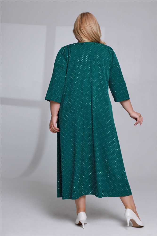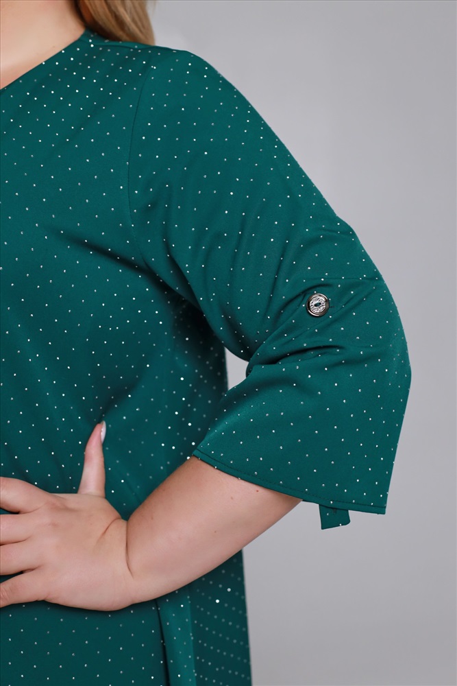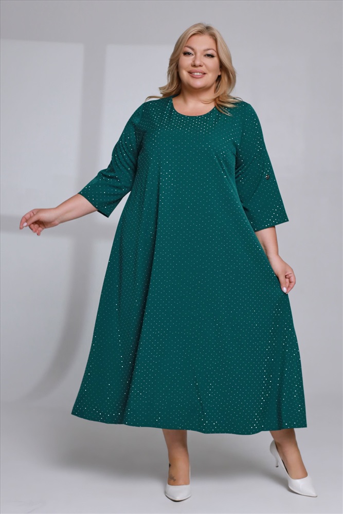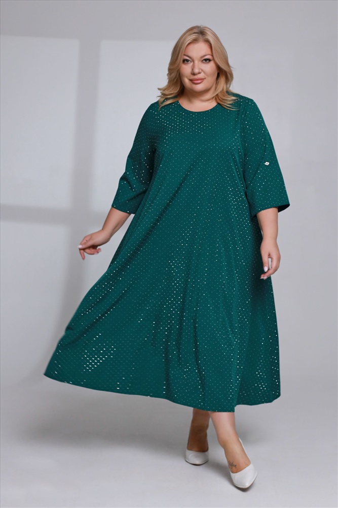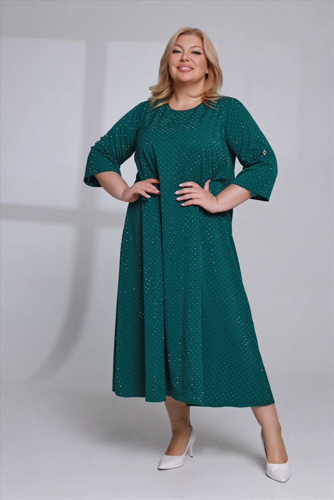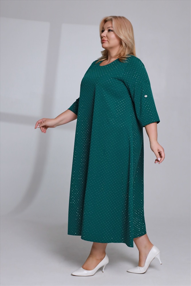 Стильное платье из мягкого материала. Модель имеет U-образный вырез. Рукава длиной 3/4 можно присобрать, при желании, хлястиком. Небольшие стразы по всему платью добавляют наряду блеск и изящество. Свободный силуэт и мягкий материал искусно обыгрывают фигуру и дарят комфорт в течение всего дня. Платье создано для того, чтобы подчеркивать достоинства и скрывать недостатки. Стильный клатч и туфли на каблуках станут идеальным дополнением к нарядному образу.