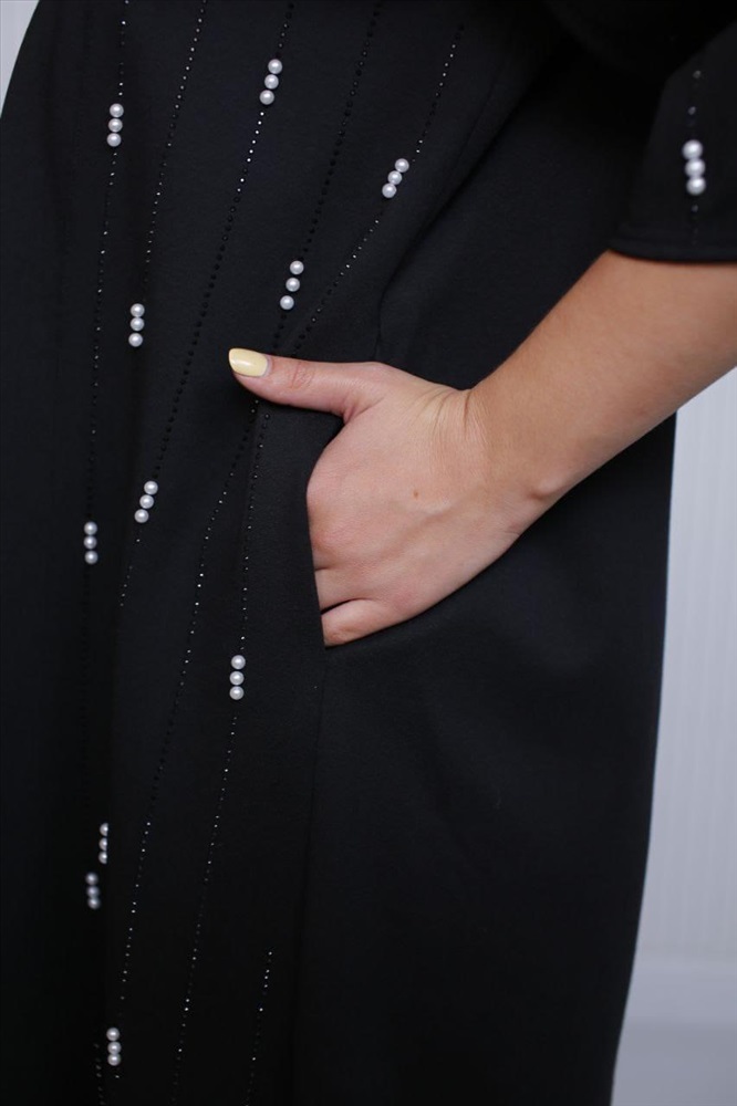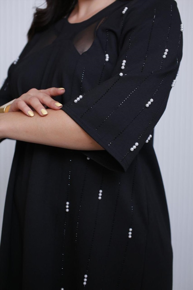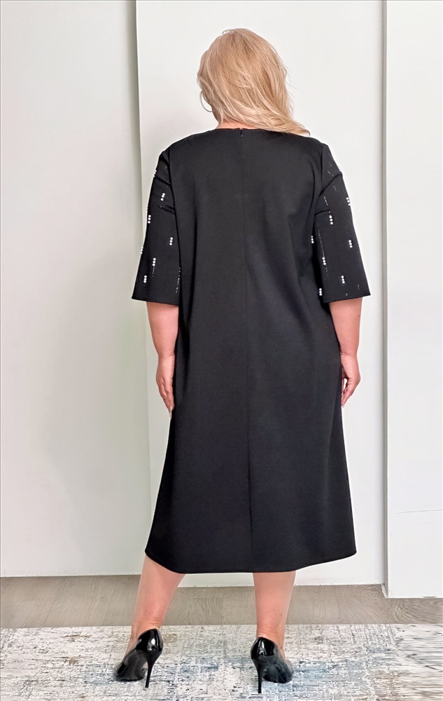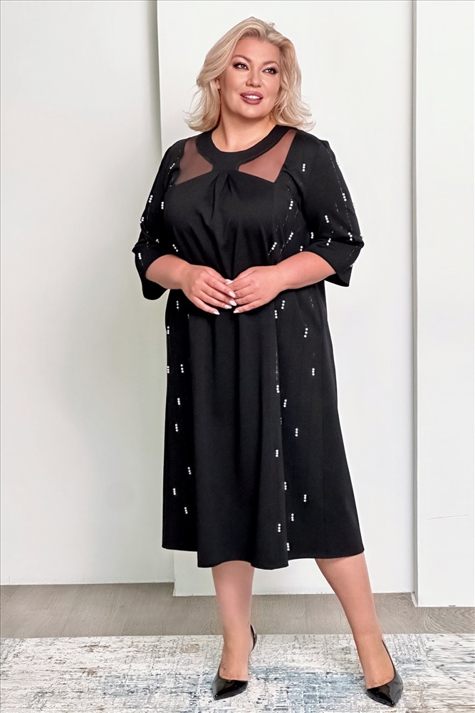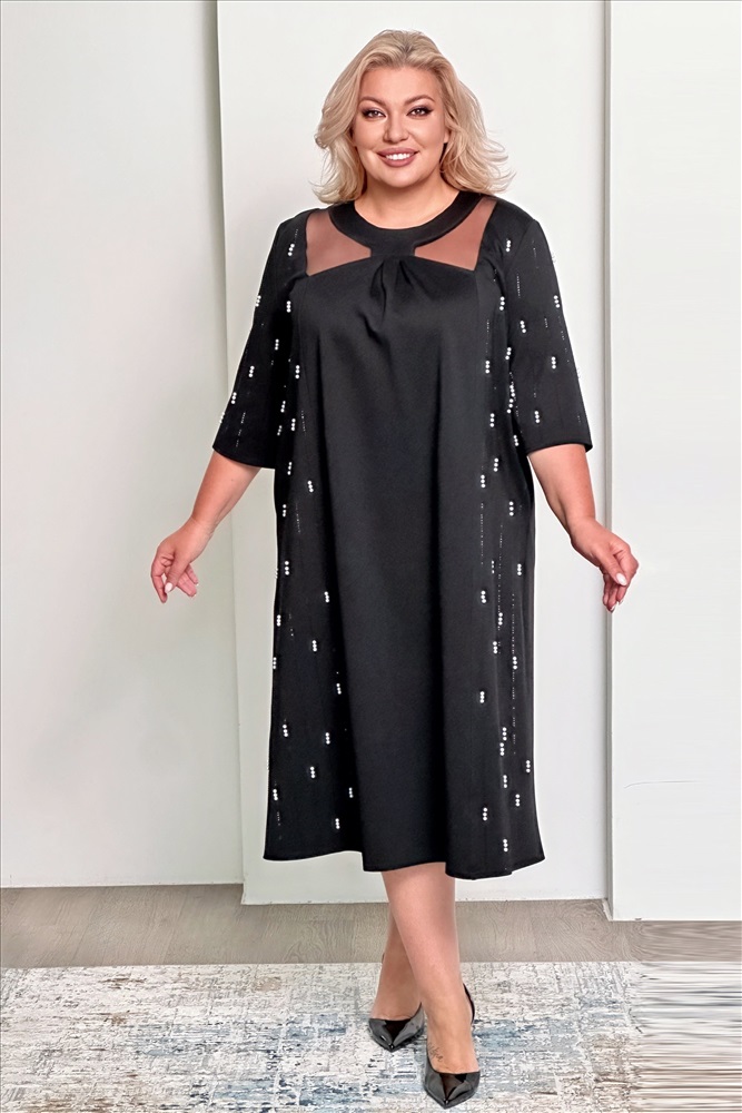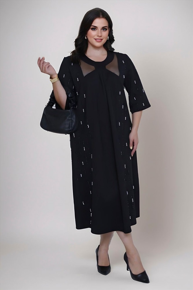 Платье свободный крой со стразами с прозрачными вставками на груди черное