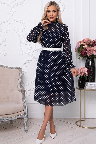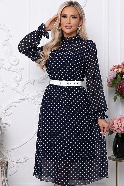 * Платье трапецевидного силуэта из шифона в горох.Ворот стойка с рюшей с застежкой сзади на петли и пуговицы.Изделие посажено на трикотажный подклад.Ремень в комплект не входит.Цвет: т.синий.