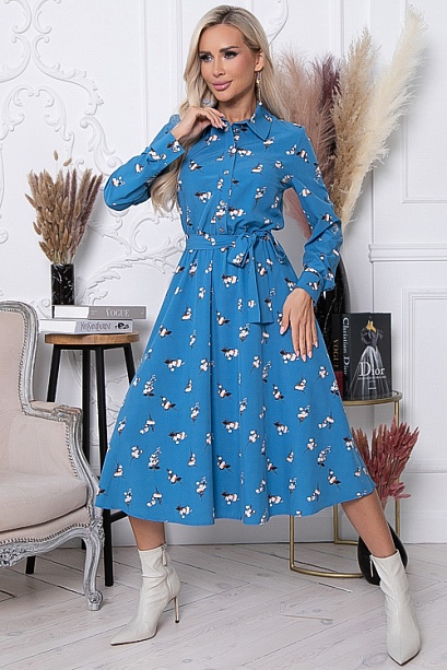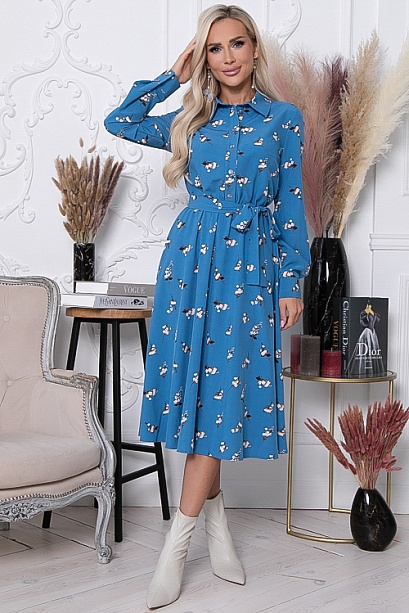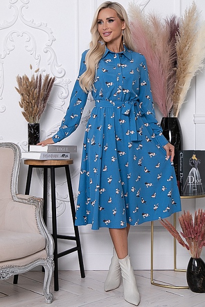 * Платье из текстильного полотна, отрезное по линии талии, присобрано на эластичную резину. Горловина оформлена отложным воротником на стойке. По полочке-планка до талии с застежкой на петли и пуговицы. Юбка изделия расклешенная и летящая. В комплекте длинный пояс из основной ткани.