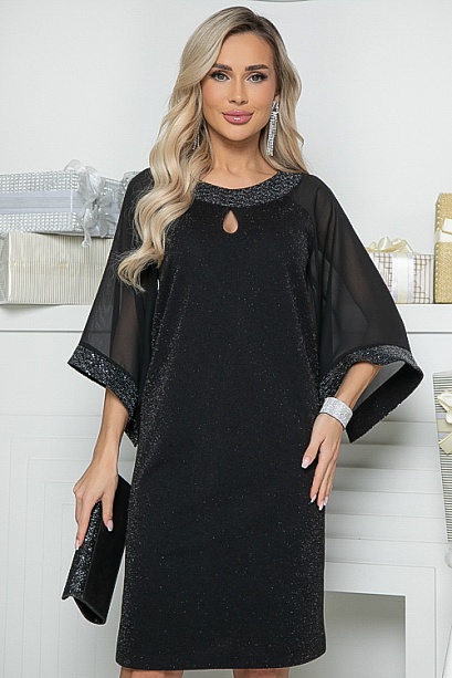 * Нарядное платье А-образного силуэта из трикотажного полотна с легким люрексом.Рукава реглан из прозрачного шифона.Горловина и манжеты рукавов выполнены из трикотажа с пайетками.