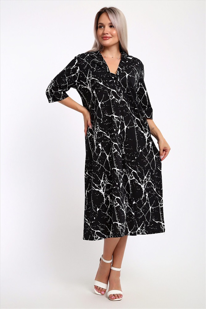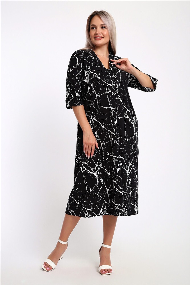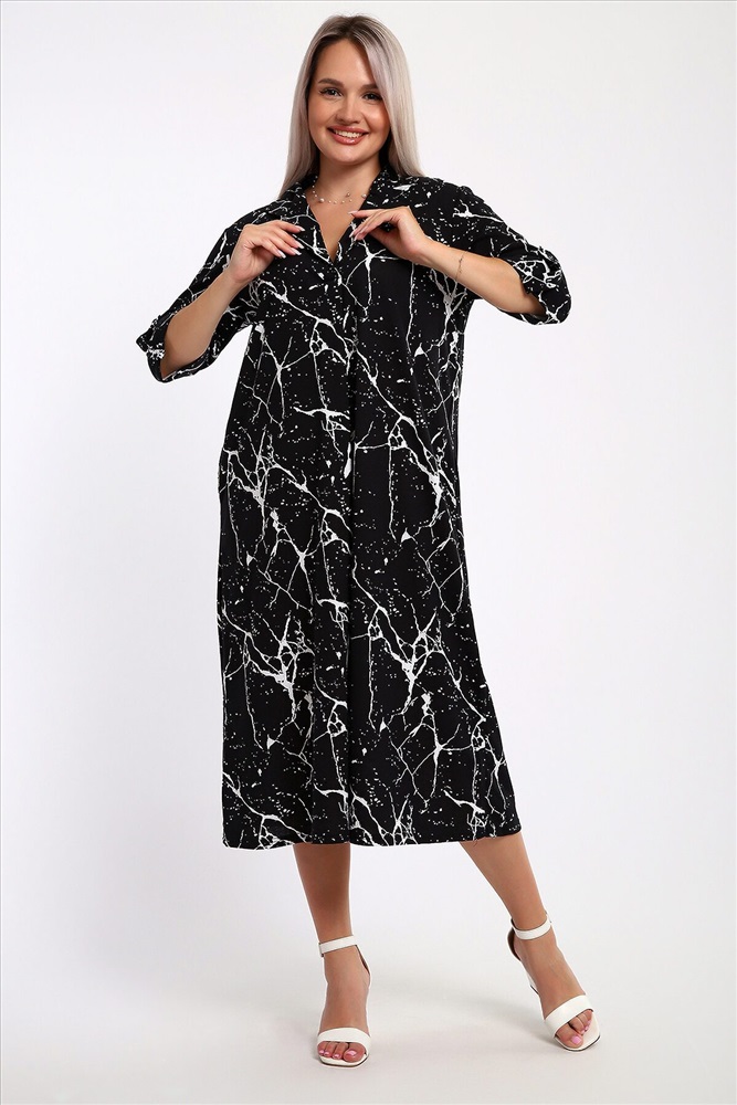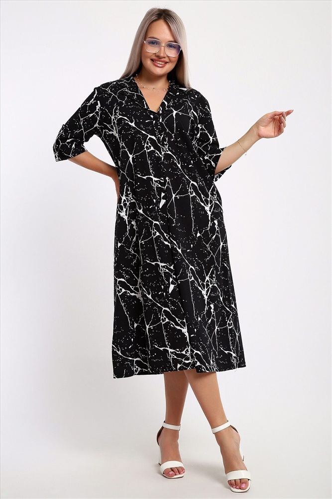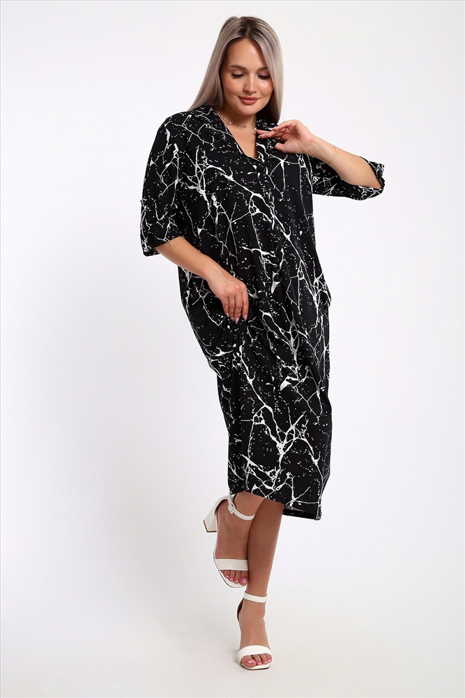 ID товара: 1178724 Состав: 100% Хлопок Сезон: Весна/Лето Длина: Миди Фасон: Свободный Рукав: 3/4 Вырез горловины: V-образный Рисунок: Абстракция Декоративные элементы: Принт Основная ткань: Хлопок Стиль: повседневный Вид ткани: Кулирка Страна бренда: Россия Страна производства: Россия Платье женское свободного покроя. Воротник отложной рубашечного типа, образует V-образный вырез. Платье с карманами в боковых швах. Длина платья чуть выше щиколотки. Рукав 3/4 с манжетой, поднят патой. На моделе представлен 48 размер. Параметры модели: 97-71-101, рост 165 см. Комментарии к товару