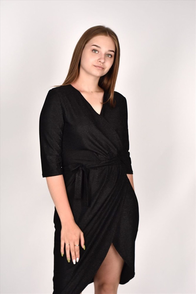 Красивое эффектное платье выполнено из блестящего материала с люрексом. Приталенный фасон на запах и глубокое декольте на груди подчеркнёт естественную красоту и зрительно сделает фигуру более женственной и элегантной. Модель прямого кроя с V образным вырезом и завязками на талии представлена в длине миди до колена спереди и чуть ниже сзади. Однотонные светлые и темные расцветки: блестящее черное, серебристое - в любом вы будете роскошны и незабываемы. Модное стильное длинное платье халат подчеркивает силуэт и скрывает недостатки. В нем вы будете чувствовать себя молодежно и сексуально, но в то же время нежно и мило. А классические рукава 3/4 добавляют слегка строгие нотки. Можно использовать для многих случаев, включая выпускной, день рождения, корпоративы.