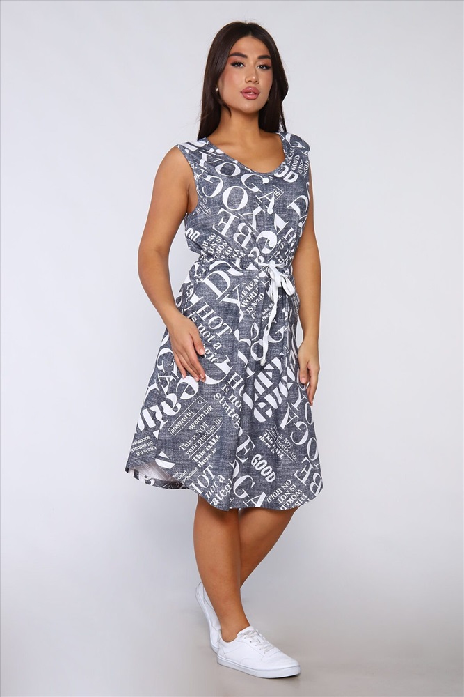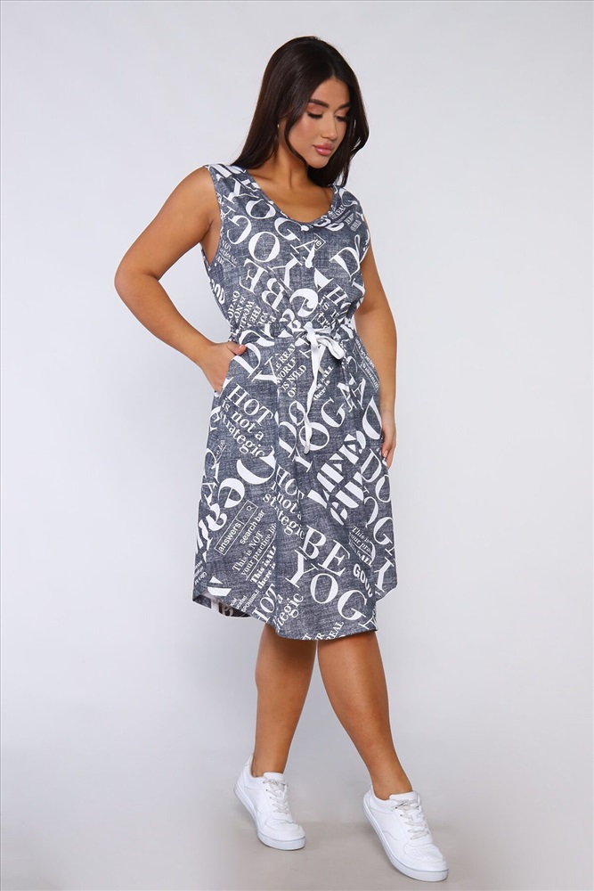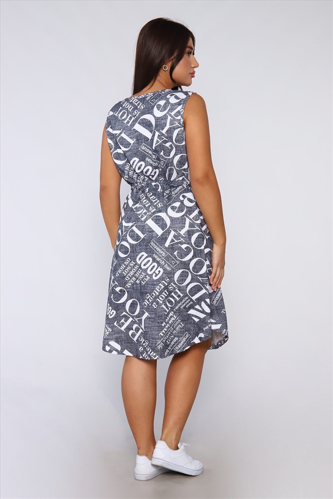ID товара: 941757 Состав: Хлопок 100% Сезон: Весна/Лето Длина: Миди Фасон: Полуприталенный Рукав: без рукавов Вырез горловины: V-образный Рисунок: Надпись Основная ткань: Хлопок Стиль: Повседневный Вид ткани: Кулирка Страна бренда: Россия Страна производства: Россия Платье женское без рукавов. Данная модель выполнена из трикотажного полотна кулирка (хлопок 100%). На полочке присутствуют накладные карманы и планка - обманка с пуговицами. Для того чтобы подчеркнуть силуэт в районе талии имеется кулиска. Горловина и пройма обработана окантовкой из основной ткани. Отличная модель для повседневной и домашней носки. Комментарии к товару