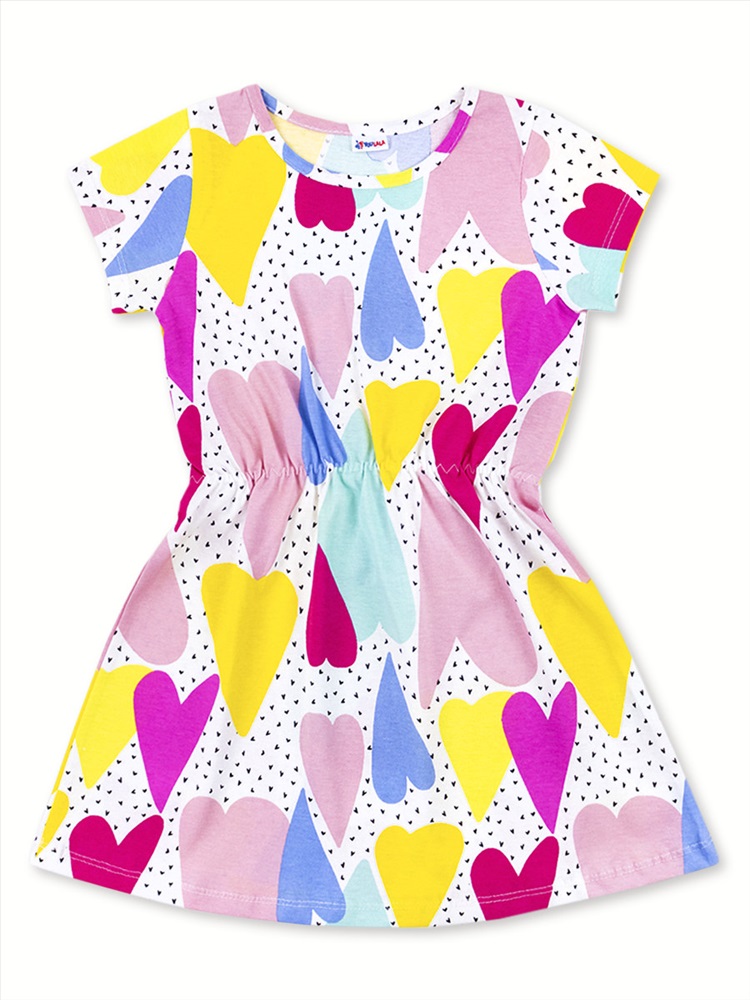 Симпатичное платье для девочки, изготовленное из 100% хлопка - кулирки. На поясе мягкая зиг-заг резинка. Модель украшает чудесный набивной рисунок в сердечки.