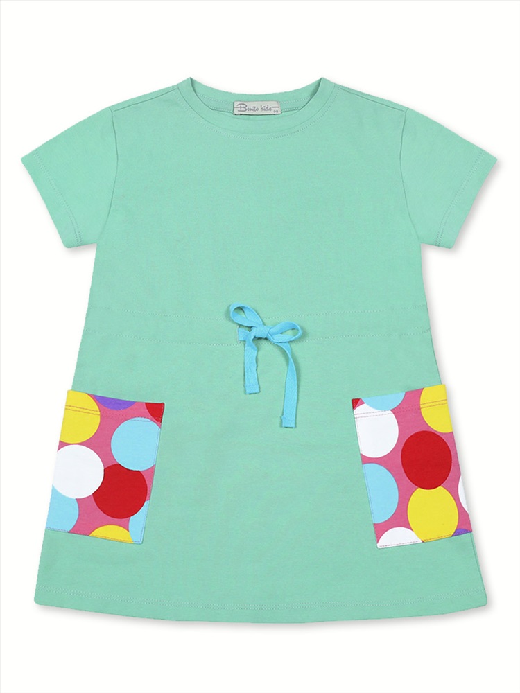 Замечательное платье для девочки, изготовленное из тонкого трикотажа - кулирки с добавлением лайкры. По вороту - мягкая трикотажная манжета, пояс с завязками. Модель украшают два накладных кармана с ярким набивным рисунком.
