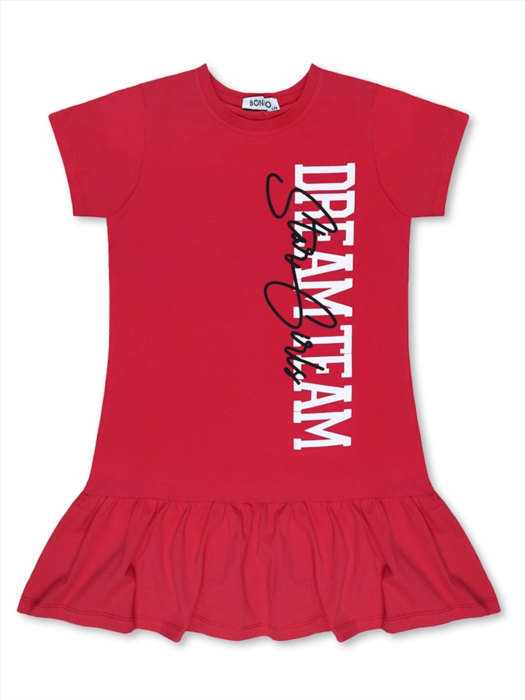 Материал: Кулирка с лайкрой Состав: Хлопок 92%, лайкра 8% Цвет: Красный Рисунок: Надпись Стильное платье для девочки, изготовленное из тонкого эластичного трикотажа - супрема. По вороту - мягкая трикотажная манжета, по низу изделия - широкий волан. Модель украшает классный принт в виде надписи. Замеры модели: Размер 128: длина 67,5 см, ширина 37 см; Размер 134: длина 68,5 см, ширина 38 см; Размер 140: длина 70,5 см, ширина 40 см; Размер 146: длина 73 см, ширина 41 см; Размер 152: длина 74 см, ширина 43 см.