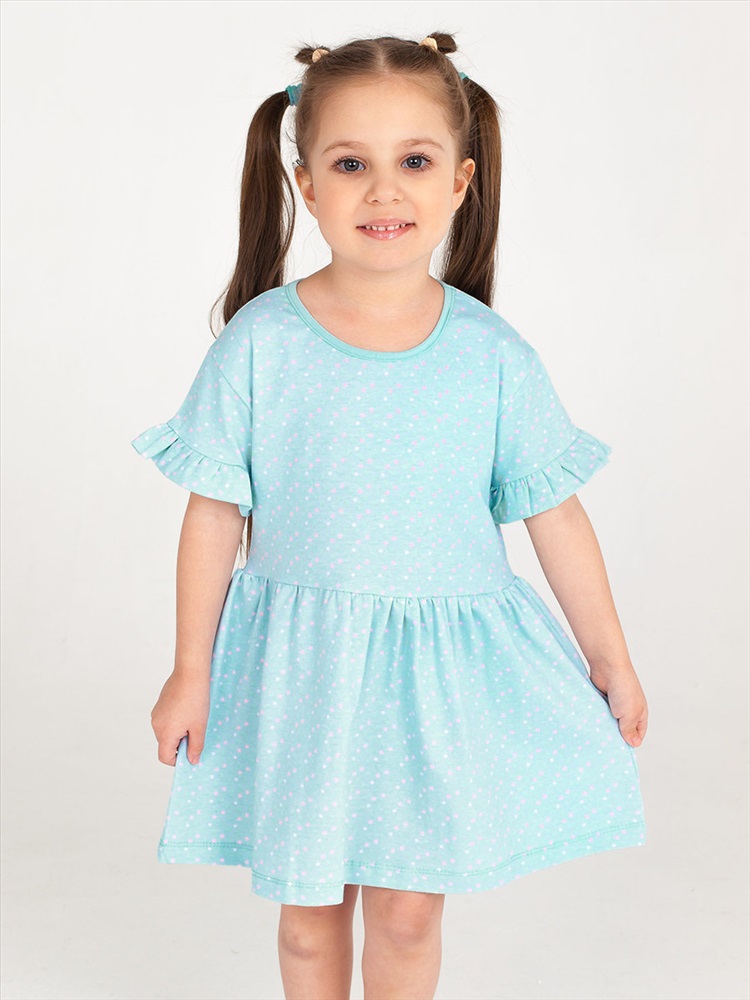 Страна: Узбекистан Материал: Кулирка с лайкрой Состав: Хлопок 92%, лайкра 8% Цвет: Голубой Рисунок: Цветы Очаровательное платье для девочки из кулирки с лайкрой. Юбка отрезная в сборку, на рукавах - декоративные оборки. Модель украшает симпатичный набивной рисунок. Замеры модели: Размер 98: длина 49 см, ширина 29,5 см; Размер 104: длина 53 см, ширина 32 см; Размер 110: длина 55 см, ширина 33 см; Размер 116: длина 59,5 см, ширина 34 см.