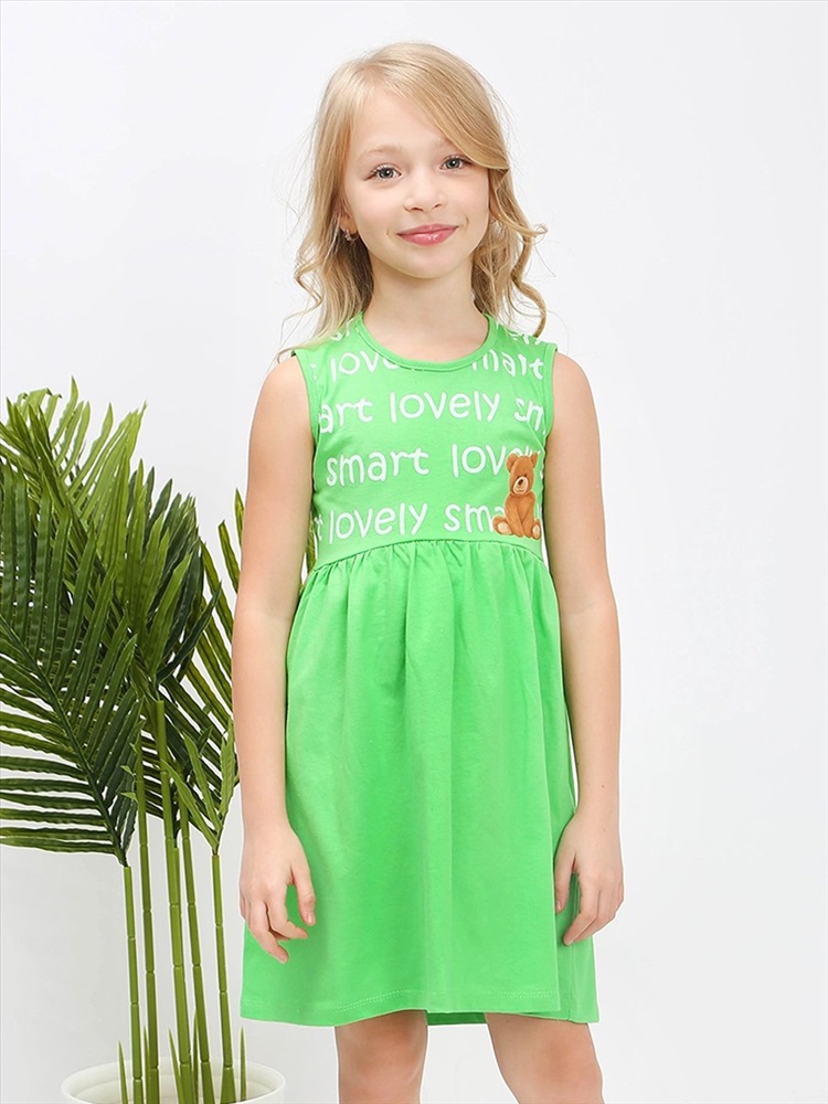 Страна: Россия Материал: Кулирка Состав: Хлопок 100% Цвет: Салатовый Рисунок: Медвежонок Чудесное платье для девочки из лёгкого хлопкового трикотажа - кулирки. Юбка отрезная в сборку. Модель украшает симпатичный принт на полочке и спинке. Замеры модели: Размер 104: длина 55 см, ширина 29 см; Размер 110: длина 58 см, ширина 30,5 см; Размер 116: длина 61 см, ширина 31 см; Размер 122: длина 64 см, ширина 31,5 см; Размер 128: длина 67 см, ширина 32 см; Размер 134: длина 69 см, ширина 33 см; Размер 140: длина 73 см, ширина 34 см.