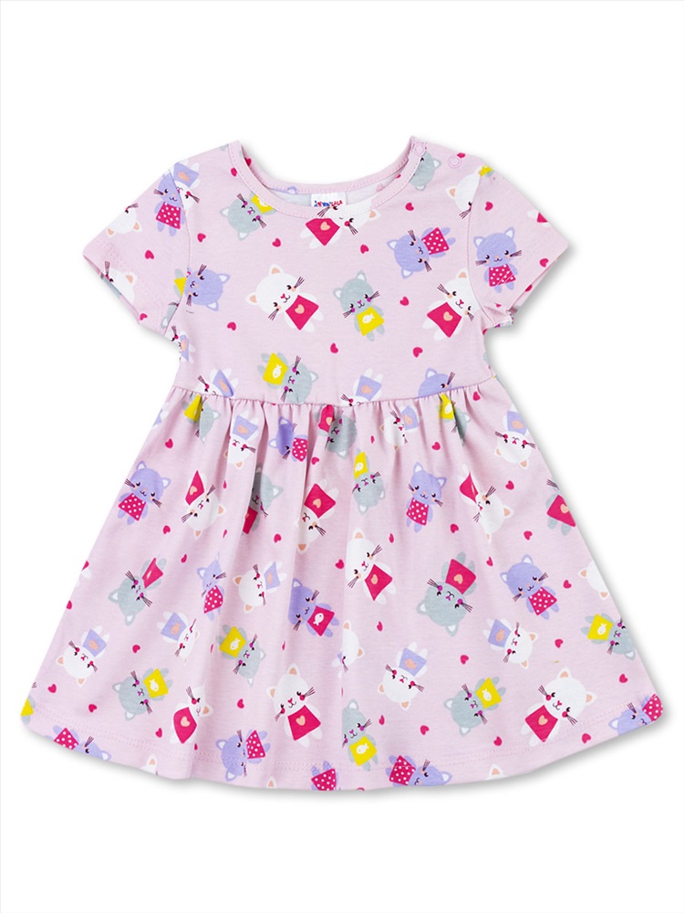 Чудесное платье для девочки, сшитое из 100% хлопка - интерлока. На одном плечике застёгивается на кнопочки. Модель украшает красивый набивной рисунок по всему изделию.