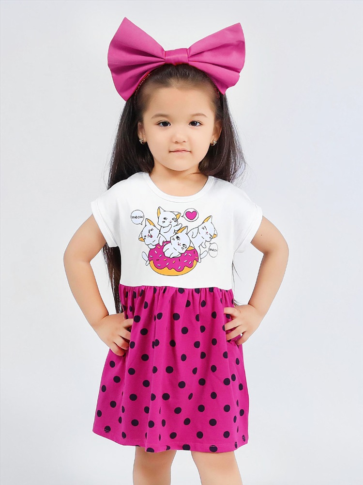 Страна: Узбекистан Материал: Кулирка с лайкрой Состав: Хлопок 92%, лайкра 8% Цвет: Белый; Малиновый Рисунок: Котята Прелестное платье для девочки, сшитое из тонкого эластичного материала - кулирки с лайкрой. На рукавах - мягкие трикотажные манжеты с отворотом. Юбка в горошек отрезная в сборку. Модель украшает чудесный принт на полочке. Замеры модели: Размер 92: длина 50 см, ширина 27 см; Размер 98: длина 53 см, ширина 29 см; Размер 104: длина 55 см, ширина 30 см; Размер 110: длина 56 см, ширина 31 см.