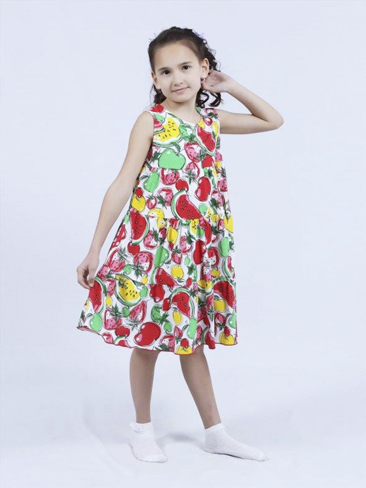 Материал: Кулирка Состав: Хлопок 100% Цвет: Белый Рисунок: Фрукты Замечательное платье для девочки, выполненное из 100% хлопка - кулирки. Отрезная юбка-солнце с двумя широкими воланами. Модель украшает красивый набивной рисунок по всему изделию. Замеры модели: Размер 122: длина 73 см, ширина 33,5 см; Размер 128: длина 74 см, ширина 35 см; Размер 134: длина 75 см, ширина 37 см; Размер 140: длина 81 см, ширина 38 см; Размер 146: длина 82 см, ширина 39 см.