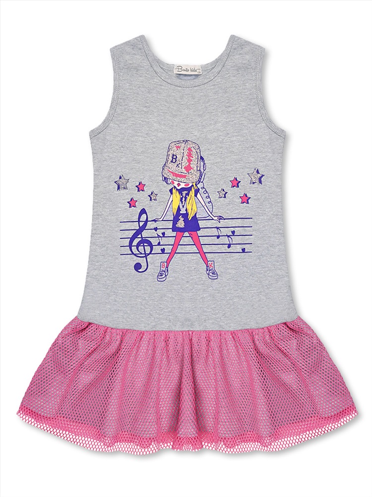Классное платье для девочки, изготовленное из тонкого эластичного материала - кулирки с лайкрой. По низу изделия имеется широкий волан с мягкой сеточкой. Модель украшает симпатичный принт с глиттером на полочке.