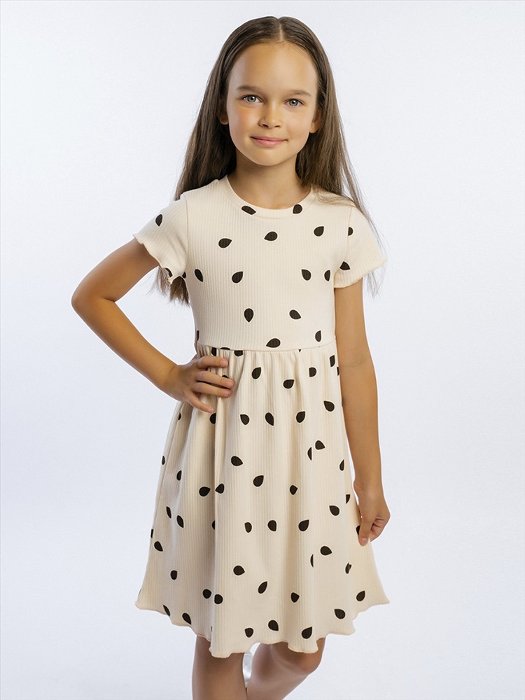 Очаровательное платье с коротким рукавом для девочки, выполненное из 100% хлопка - интерлока. По вороту - мягкая трикотажная манжета. Юбка отрезная по линии талии со сборкой. Модель украшает симпатичный набивной рисунок.