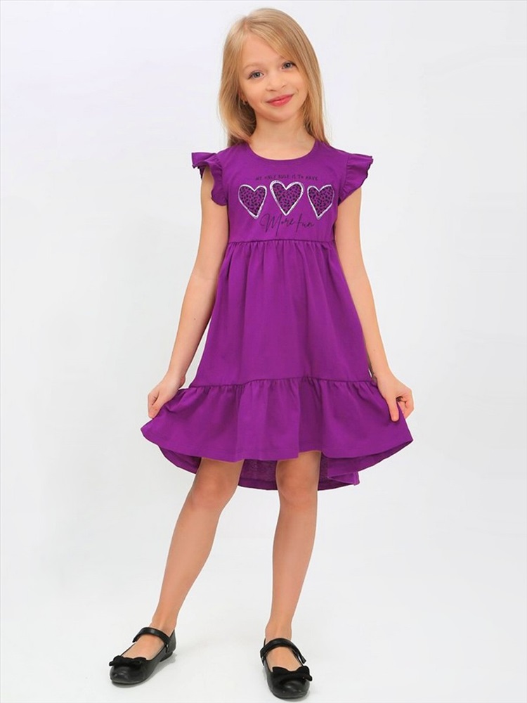 Красивое платье для девочки, сшитое из 100% хлопка - кулирки. Спинка модели удлинённая, рукава-крылышки. Модель украшают симпатичный принт с глиттером на полочке и широкий волан по низу изделия.