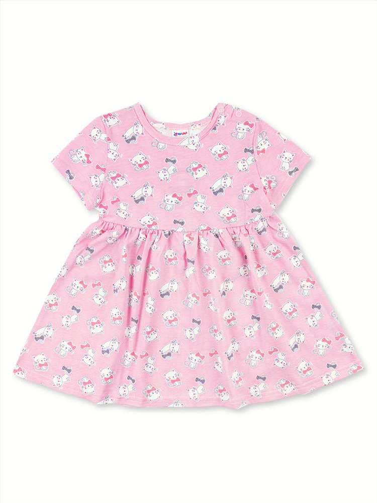 Чудесное платье для девочки, изготовленное из 100% хлопка - кулирки. На одном плечике застёгивается на кнопочки. Модель украшает симпатичный набивной рисунок.
