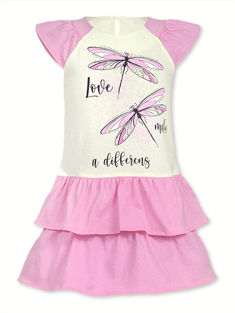 Прелестное платье для девочки, сшитое из комбинированной ткани. На спинке небольшой вырез с застёжкой на пуговку, по низу изделия два широких волана. Модель украшает красивый принт со стразами на полочке. Материал - 100% хлопок, кулирка.