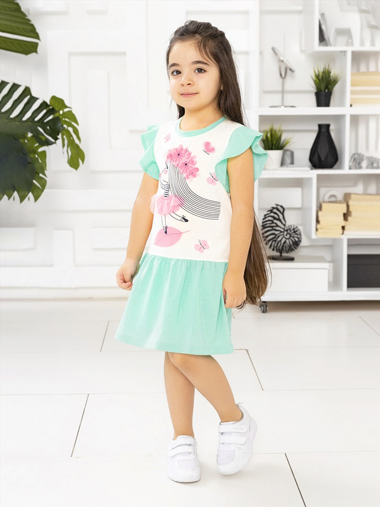 Красивое платье для девочки с заниженной линией талии. Рукава-крылышки, по вороту - мягкая трикотажная манжета. Модель украшает милая аппликация с фатином. Материал изделия - 100% хлопок, кулирка.