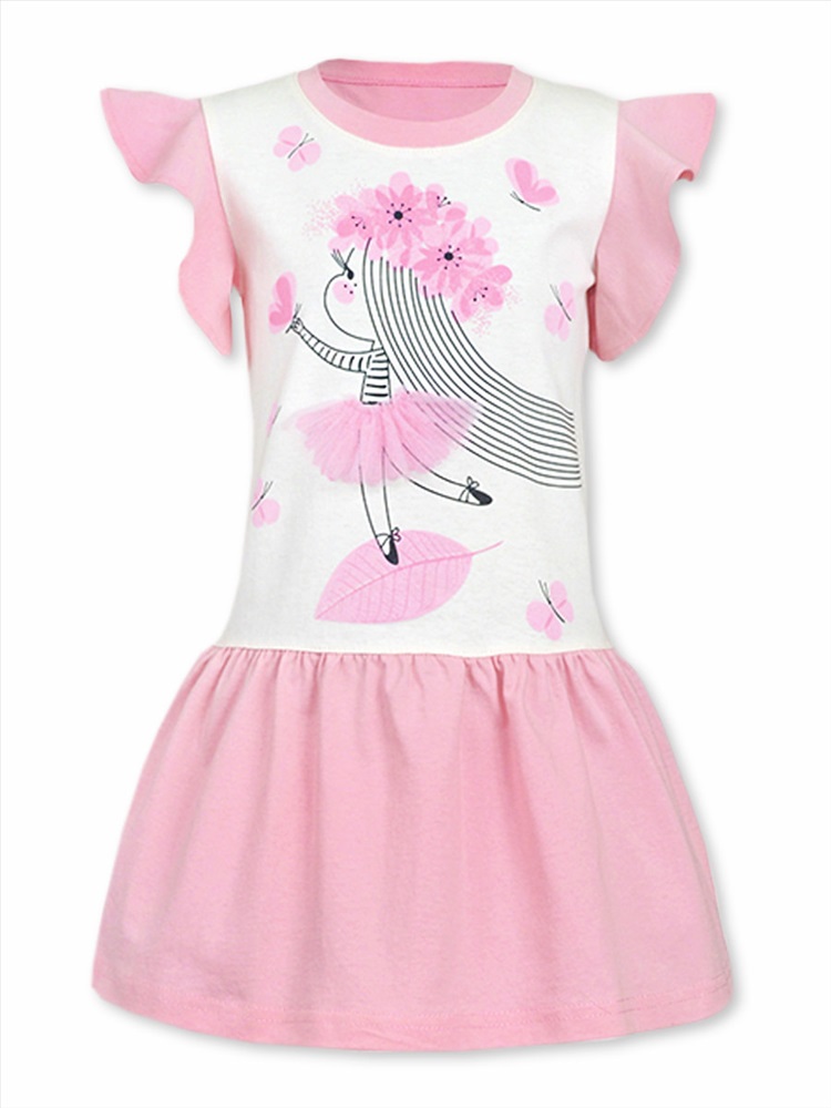 Красивое платье для девочки с заниженной линией талии. Рукава-крылышки, по вороту - мягкая трикотажная манжета. Модель украшает милая аппликация с фатином. Материал изделия - 100% хлопок, кулирка.