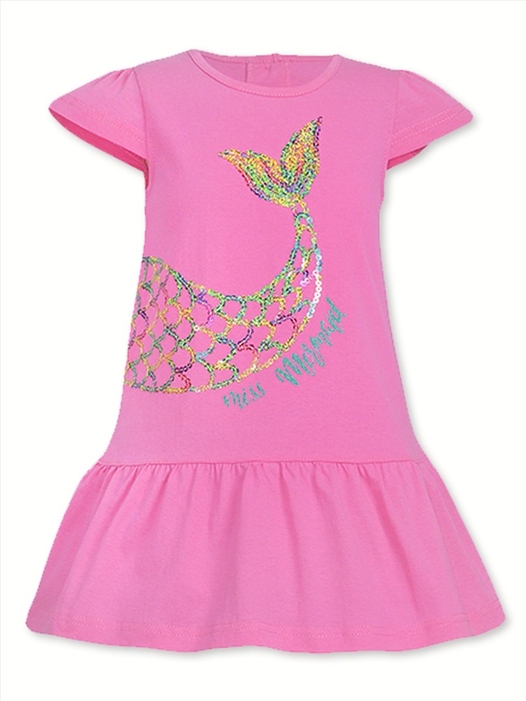 Симпатичное платье для девочки, изготовленное из 100% хлопка - кулирки. На спинке застёгивается на пуговки, по низу изделия - широкий волан. Модель украшает красивая аппликация из пайеток и небольшой принт с глиттером на полочке.