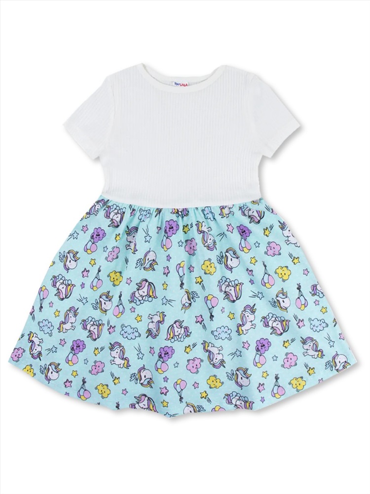 Прекрасное платье с коротким рукавом для девочки, сшитое из 100% хлопка. Верх однотонный в широкий рубчик из лапши. Юбка отрезная со сборкой, украшена очаровательным набивным рисунком из кулирки.
