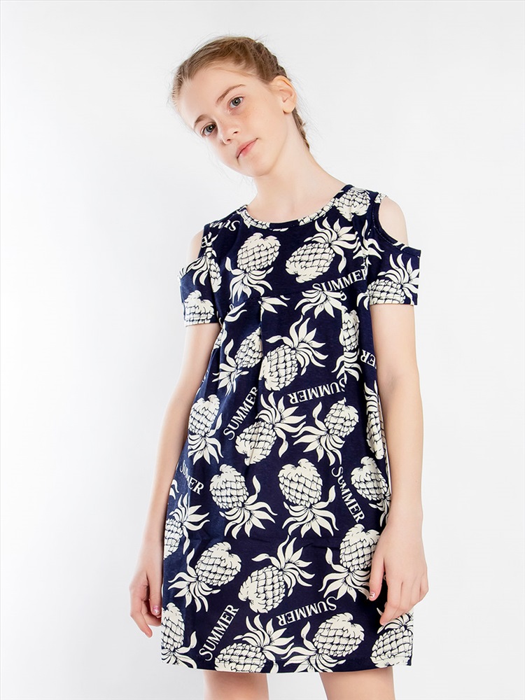 Красивое платье для девочки с завышенной линией талии. Юбка отрезная в сборку, плечики открытые. Модель украшает очаровательный набивной рисунок по всему изделию. Материал изделия - 100% хлопок, кулирка.