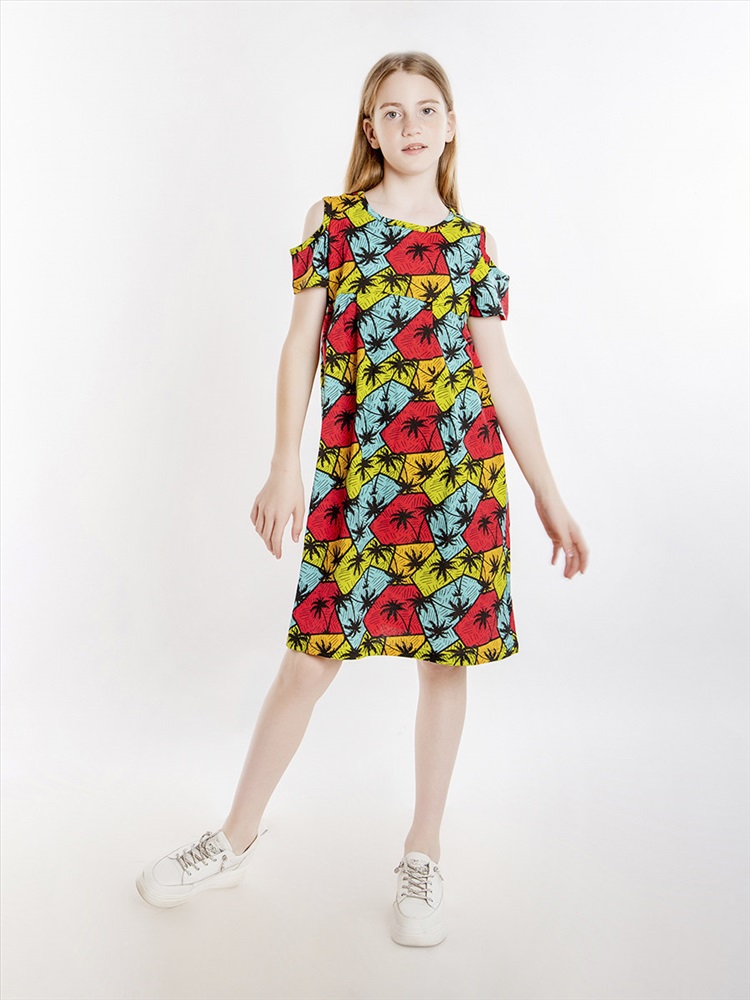 Красивое платье для девочки с завышенной линией талии. Юбка отрезная в сборку, плечики открытые. Модель украшает очаровательный набивной рисунок по всему изделию. Материал изделия - 100% хлопок, кулирка.