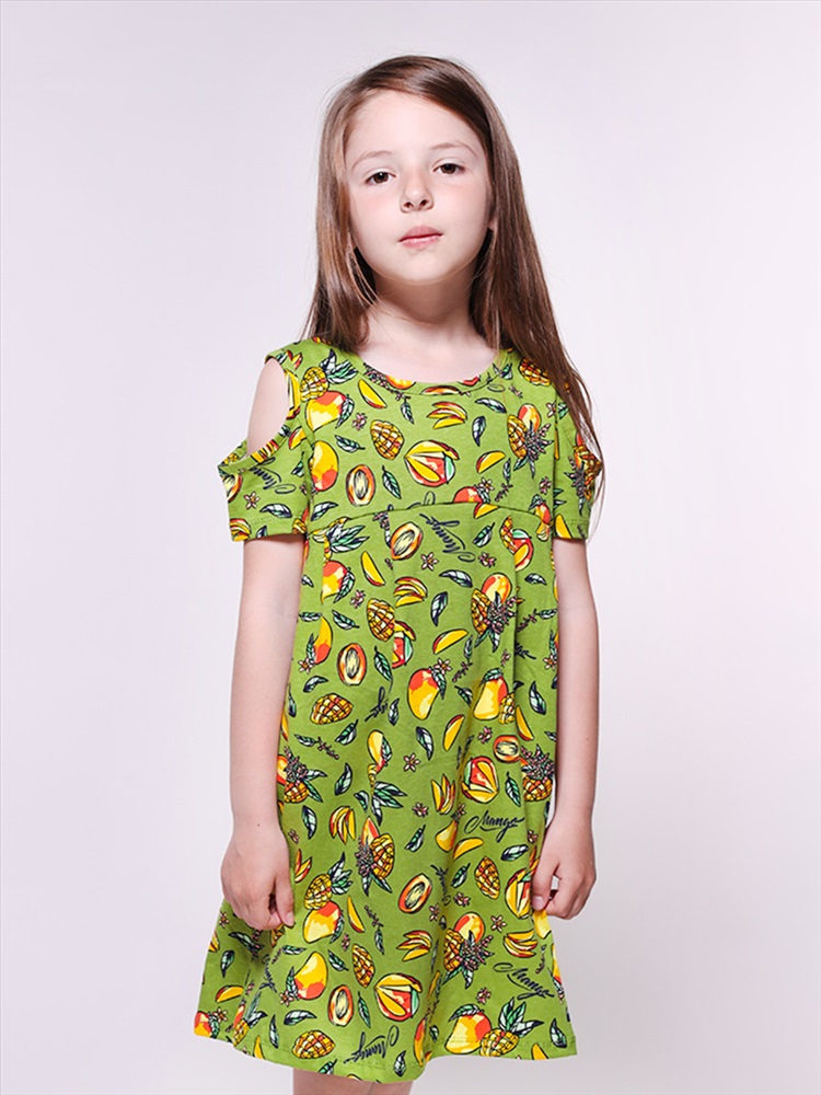 Симпатичное платье для девочки с завышенной линией талии. Юбка отрезная в сборку, плечики открытые. Модель украшает красивый набивной рисунок по всему изделию. Материал изделия - 100% хлопок, кулирка.