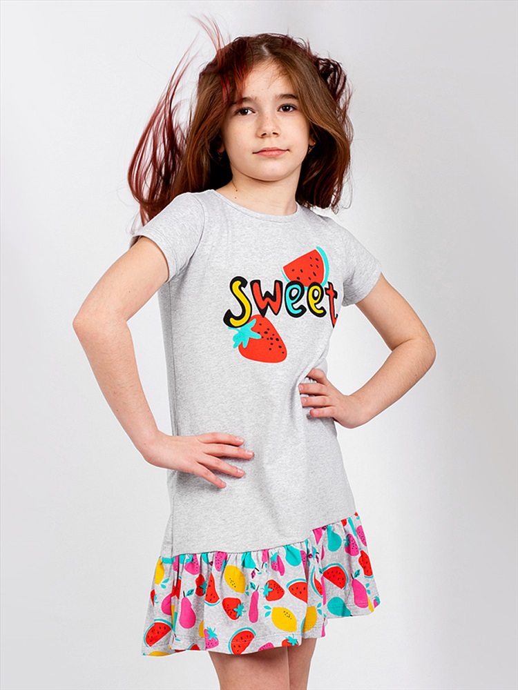 Замечательное платье из тонкого трикотажа - кулирки. На полочке - яркий принт, юбка оформлена красивым набивным рисунком.