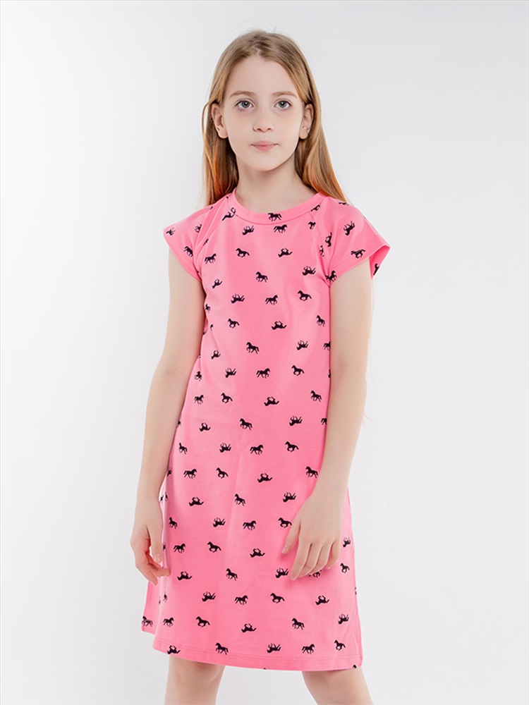 Симпатичное платье для девочки, изготовленное из 100% хлопка - пике. Силуэт платья - трапеция, рукава - реглан. Модель украшает классный набивной рисунок по всему изделию.