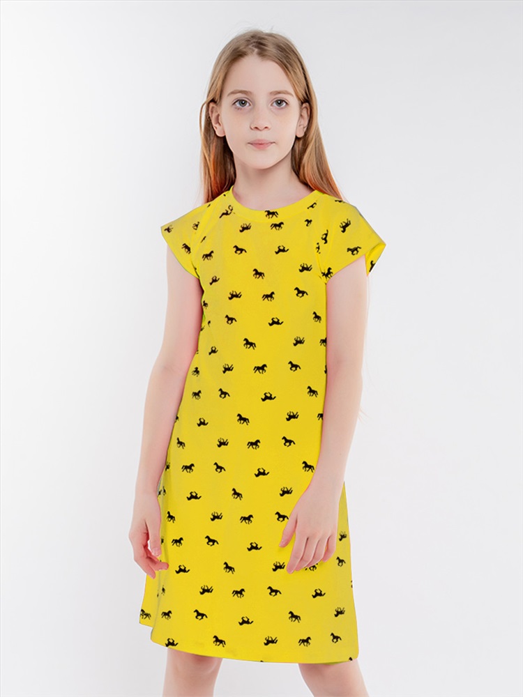 Симпатичное платье для девочки, изготовленное из 100% хлопка - пике. Силуэт платья - трапеция, рукава - реглан. Модель украшает классный набивной рисунок по всему изделию.