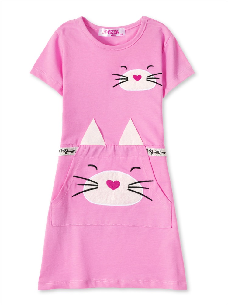 Симпатичное платье для девочки, изготовленное из тонкого материала - кулирки. Изделие имеет карман «кенгуру» и декоративные завязки на поясе. Модель украшает очаровательная аппликация на полочке и кармане.