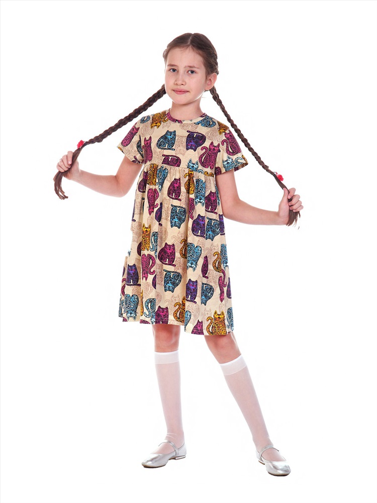 Милое летнее платье с завышенной линией талии. На спинке каплевидный вырез застёгивается на пуговку. Набивной рисунок с цветными кошками. Платье сшито из тонкого хлопка - кулирки.