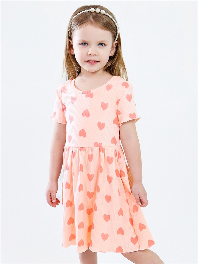 Красивое платье для девочки, изготовленное из 100% хлопка - лапши. Модель украшают прелестный набивной рисунок и волнистые края на рукавах и по низу изделия.