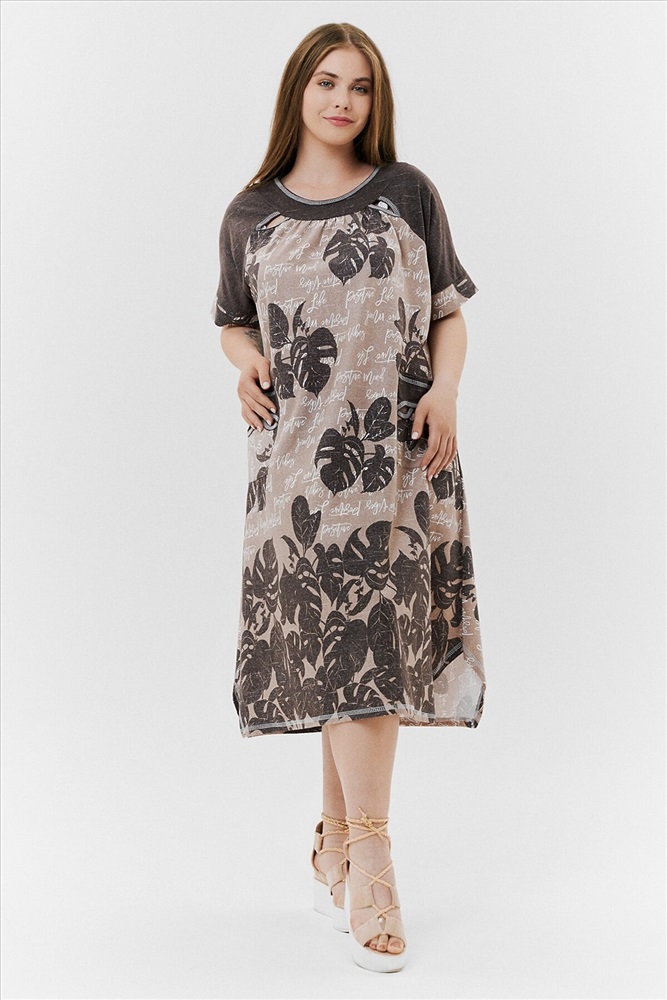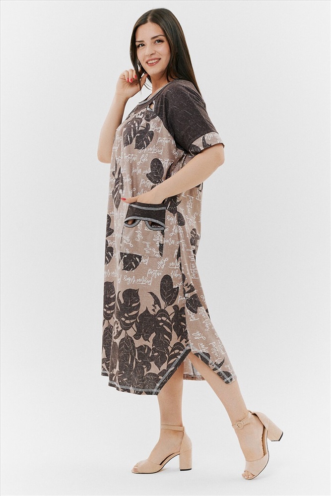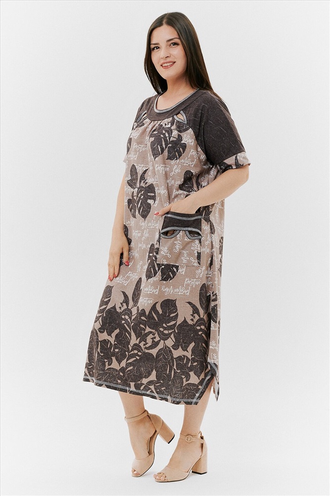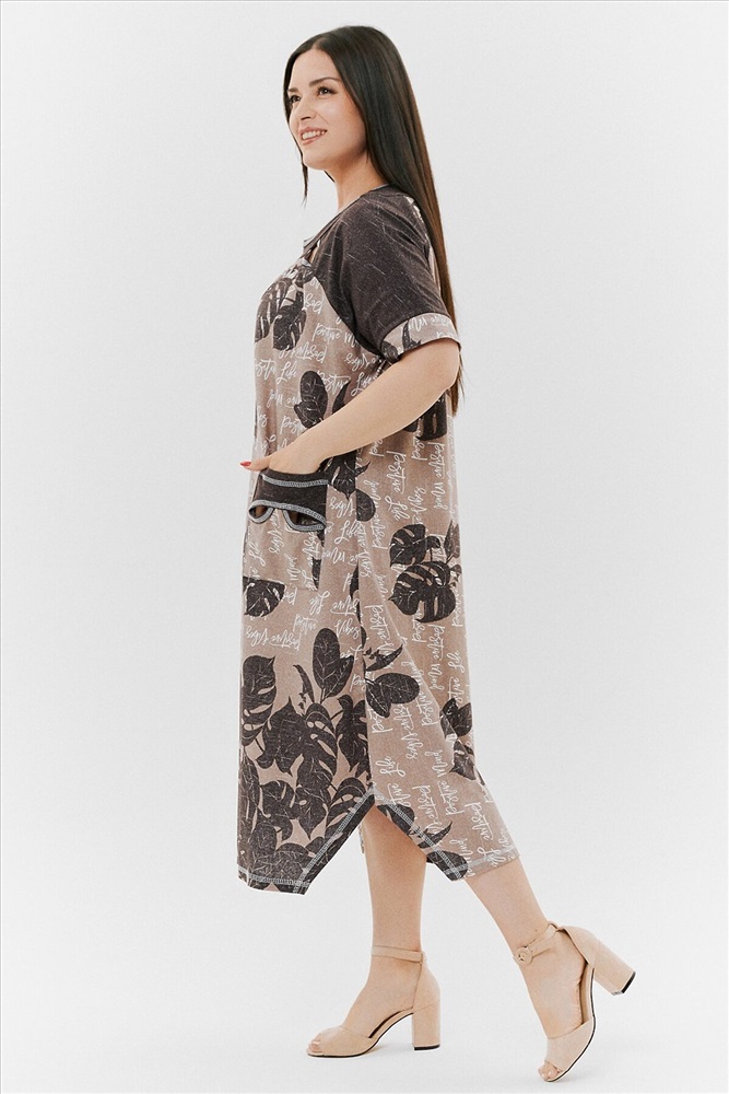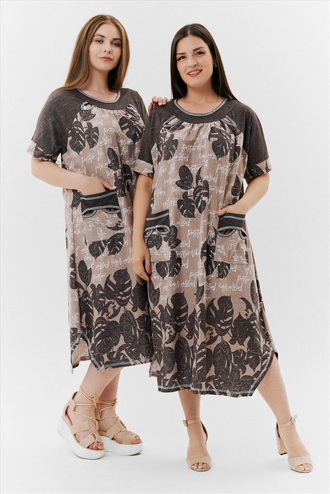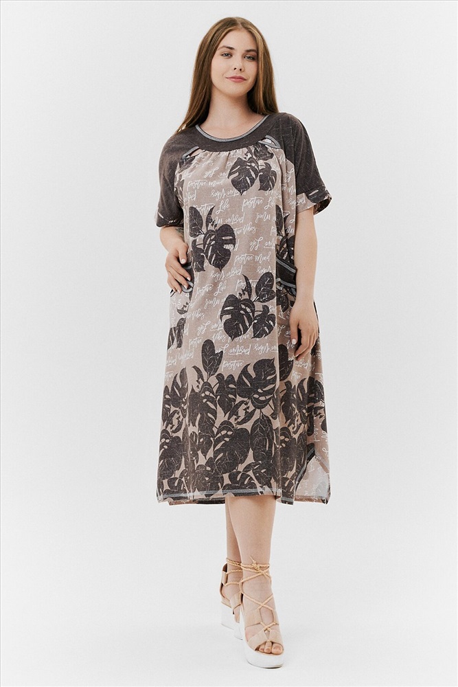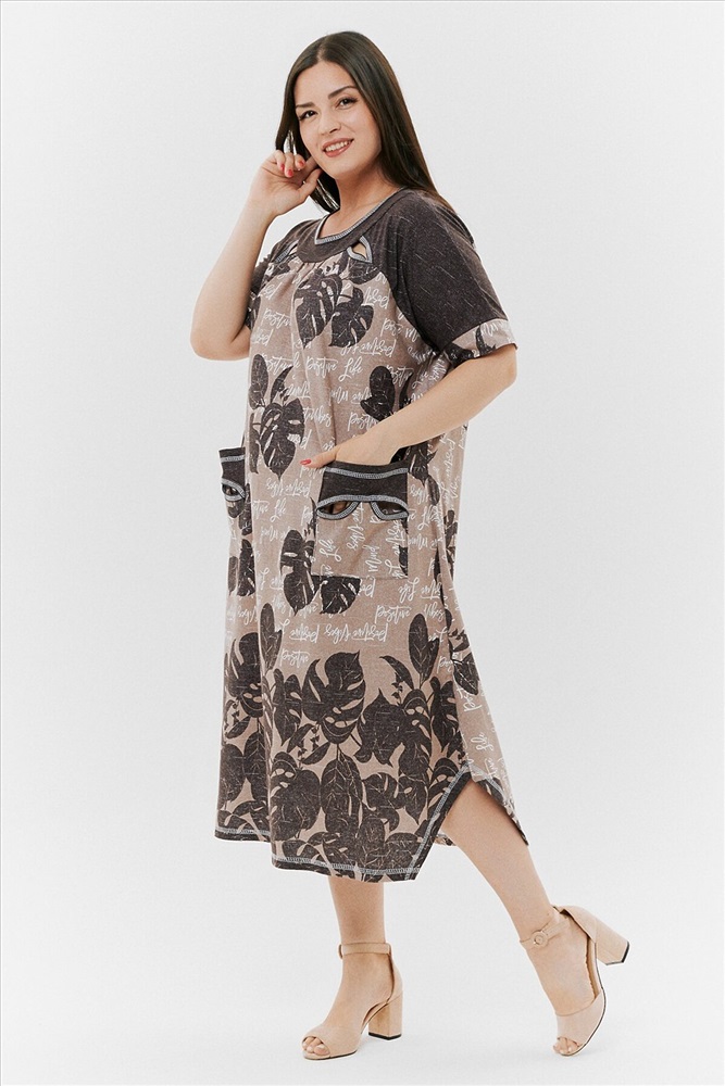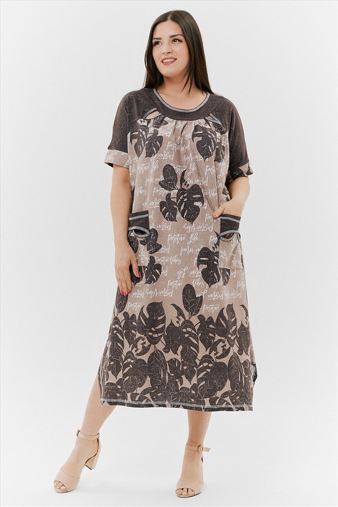 ID товара: 791430 Состав: Хлопок 100% Сезон: Весна/Лето Длина: Ниже колена Фасон: Трапеция Рукав: Короткие Вырез горловины: Округлый Рисунок: растительный Тип карманов: Накладные Декоративные элементы: Разрезы Основная ткань: Хлопок | Кулирка Стиль: Повседневный Страна бренда: Россия Страна производства: Россия Платье женское, расширенное к низу. Рукав реглан, короткий, на манжете. По горловине - обтачки, в шве притачивания рукава к полочке в области обтачки, разрез в форме листка. На полочке накладные карманы, с обтачкой и разрезами. Боковые швы внизу платья срезаны под углом. Комментарии к товару