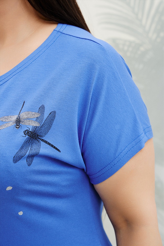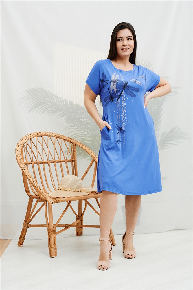 Застежка: без застежки Платье женское полуприлегающего силуэта, слегка расширенное к низу. Рукав цельнокроенный короткий. Горловина округлая. В боковом шве внутренние карманы. На полочке крупный стильный принт.
