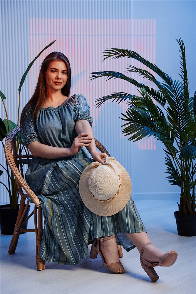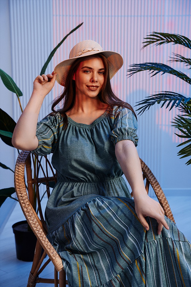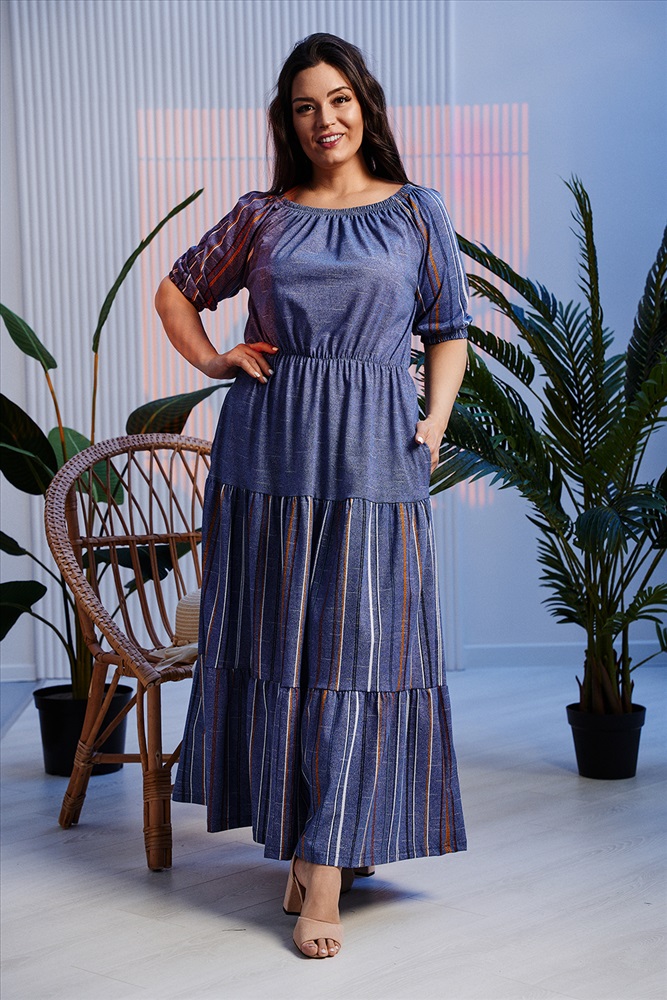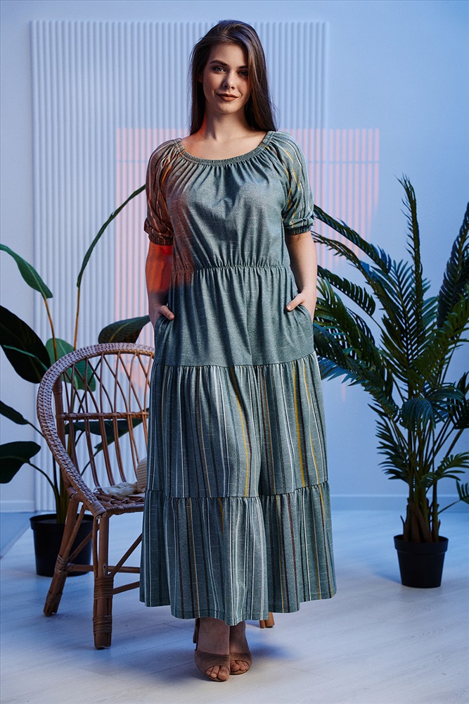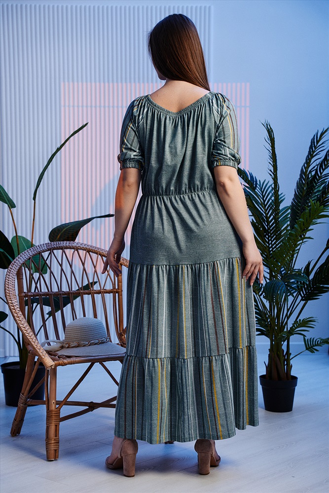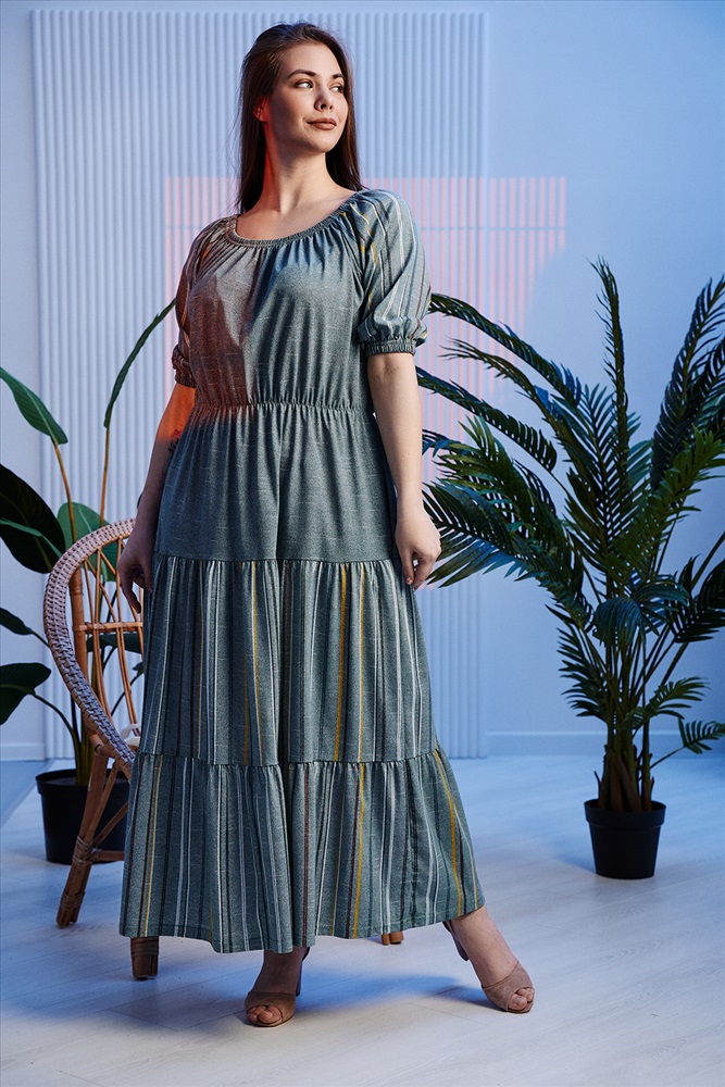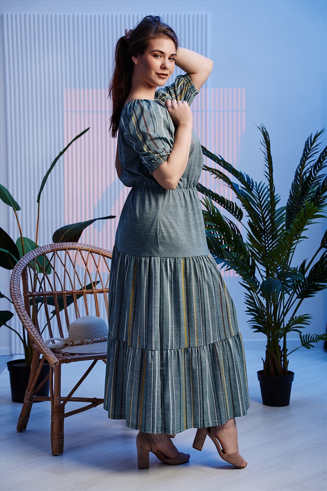 Платье женское приталенное. Горловина, низ рукава, талия собраны на резинку. Рукав реглан, до локтя. Полочка и спинка однотонные. Рукав, два яруса платья из ткани в полоску.