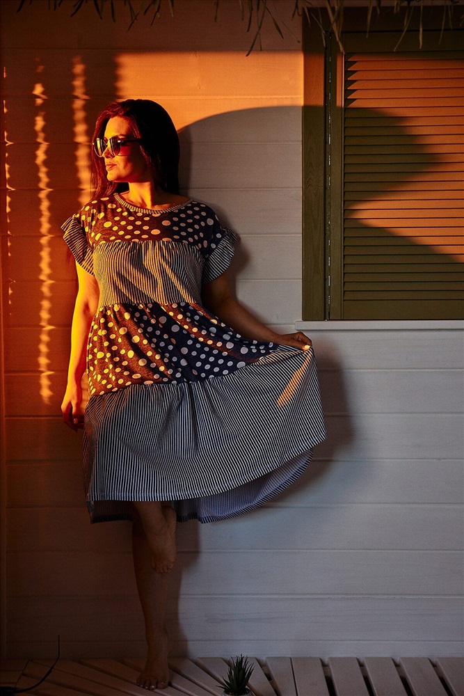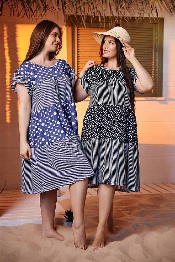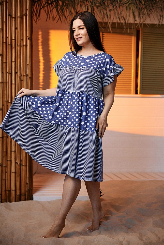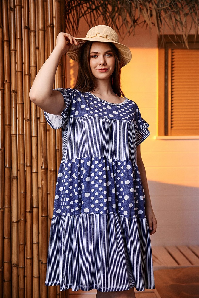 Платье женское, свободное, к низу расширенное за счет сборки каждого из трех ярусов. Рукав цельнокроеный короткий, внизу рукава рюша. Вырез горловины округлый. Эта модель платья очень комфортна для любого типа женской фигуры, а сочетание ткани в горошек и полоску придает изделию особую привлекательность.