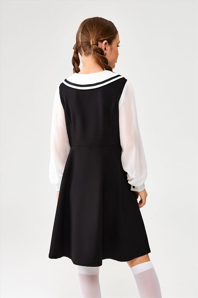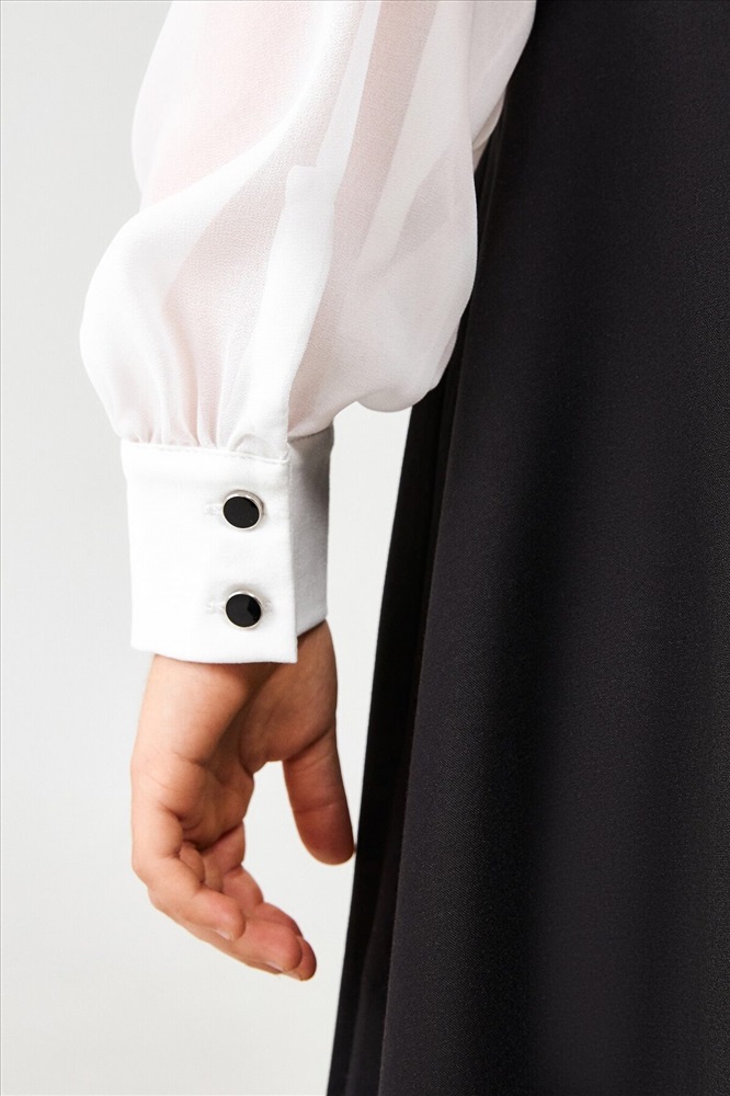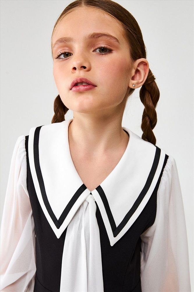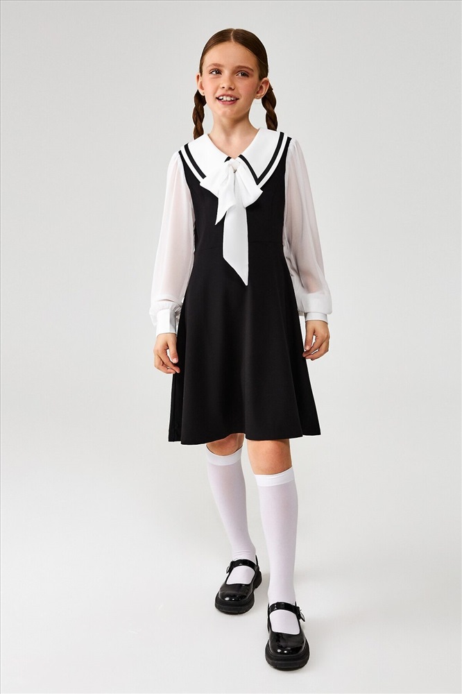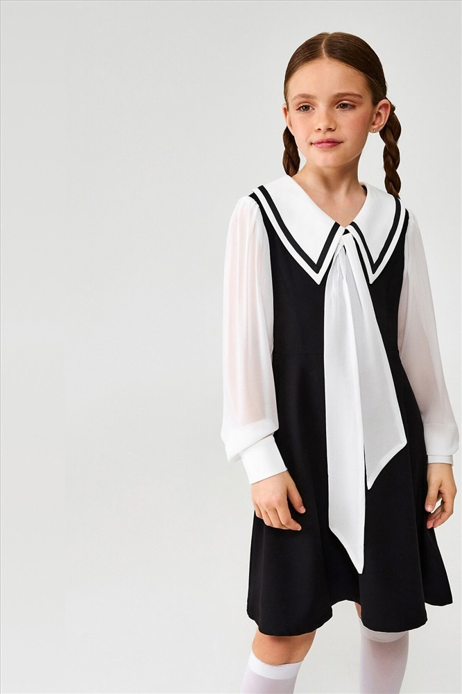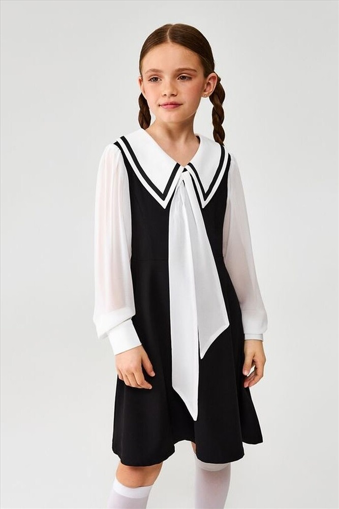 Детское платье для девочки из школьной коллекции изготовлено из костюмной ткани, которая отлично держит форму, быстро сохнет и свободно пропускает воздух. Эти качества особенно важны для активных детей, так как обеспечивают комфорт и удобство в течение всего дня. Платье приталенное и подходит для всех типов фигур, подчеркивая изящный силуэт.Изделие оснащено модным отложным несъёмным воротничком, декорированным атласными завязками, что придаёт образу утончённость и элегантность. Длинные объёмные рукава с манжетами на пуговицах добавляют изысканности и практичности. Застёжка в виде молнии на боковом шве обеспечивает удобство при надевании и снятии.Сочетая в себе стиль и функциональность, это платье прекрасно подойдёт как для повседневной носки в школу, так и для особенных мероприятий.