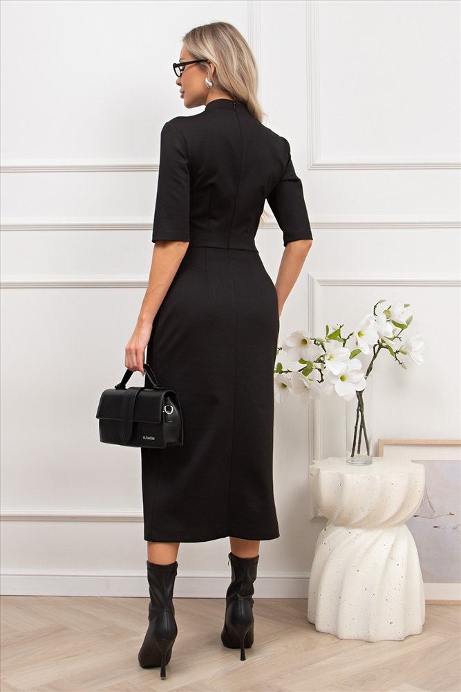 Женственное платье прилегающего силуэта из плотного трикотажного полотна.Короткий втачной рукав. Горловина оформлена воротником- стойка. По линии груди заложена одна вытачка. В левом плечевом шве заложены мягкие складки. Модель отрезная по линии талии.